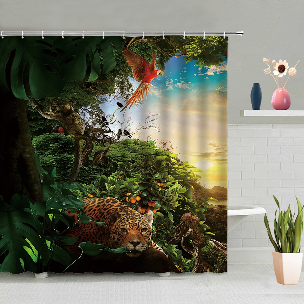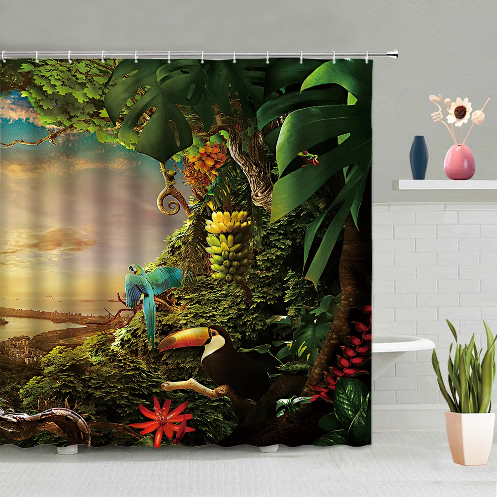 Зеленые джунгли, животные, занавеска для душа, тигр, попугай, обезьяна, олень, лягушка, зеленые листья, тропические фрукты, фоновое украшение с крючками