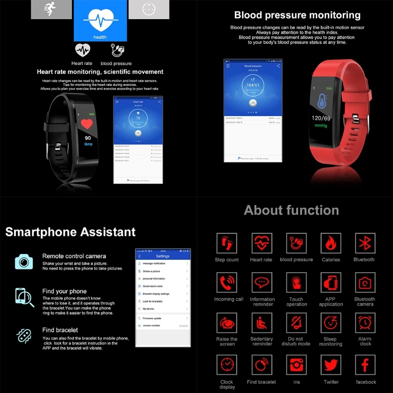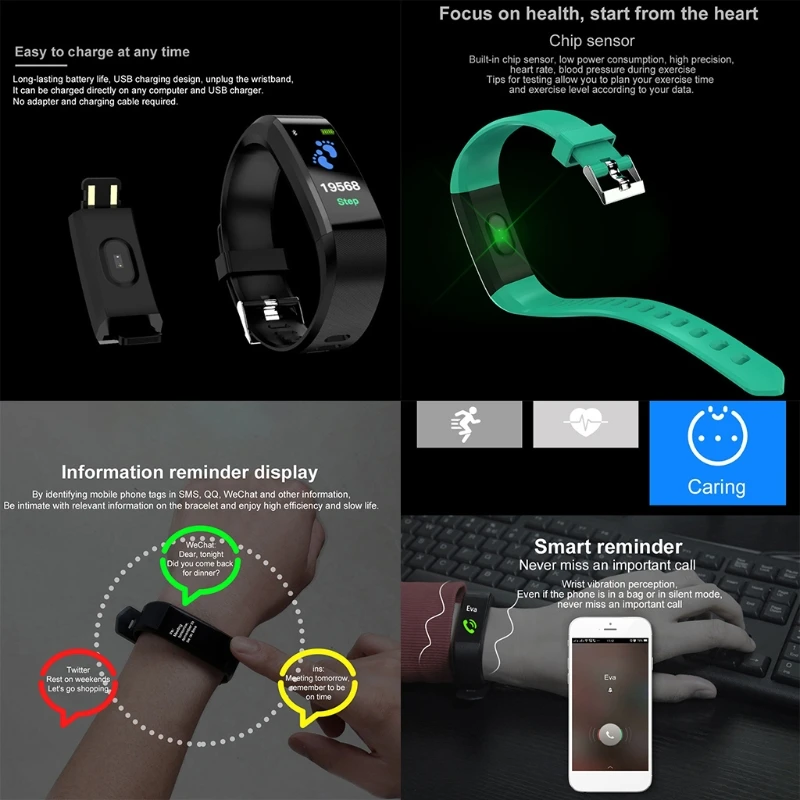 115Plus спортивные Смарт-часы, браслет, пульсометр, кровяное давление, мужские Смарт-часыХарактеристика:1.SMS, информация, напоминания о звонках, информация push: вызов, SMS, facebook и т. Д.2. Синхронизация Bluetooth.3. Синхронизация данных не требует кабеля.4. Удаленная камера, фотографируйте по телефону с помощью пульта дистанционного управления браслета.5. Трекер активности, запись ежедневной активности: шаги, расстояние, время, калории; Проверка и обмен данными в любое время.6. Анти-потеря, браслет будет напоминать вам вибрацию, когда ваш телефон находится в 5 м от вас.7. Когда Bluetooth отключен или телефон не на расстоянии Bluetooth, часы предупредят вас.8. Монитор сна, проверьте тренд сна, чтобы просмотреть время и качество сна.9. Напоминание о малоподвижности, установите его, чтобы напомнить вам ходить или тренироваться после долгого сидения.10.IPX7 водонепроницаемый, умный Браслет из воды (не для плавания или принятия душа).11. Монитор сердечного ритма и монитор артериального давления.12. Прямая зарядка через USB.Спецификация:Модель устройства: ID 115PLUS браслет с сердечным ритмомНабор микросхем: HS6620Bluetooth: 4,0 (версия Bluetooth: 4,0 и выше)Батарея: 50мА полимерный литий-ионныйВремя зарядки: 1 часВодонепроницаемый: водонепроницаемыйСовместимая система: для ios7.1 и выше, для Android4.4 и вышеВремя работы в режиме ожидания: 5 -7 днейДиапазон синхронизации: 3 м (теоретический диапазон составляет 10 м без каких-либо помех)Основные функции: мониторинг сердечного ритма, подсчет шагов, сжигание калорий, расстояние, RTC дисплей, автоматический мониторинг сна, напоминание о звонках, информационный сигнал, напоминание о тревоге, анти-потеря, дистанционное управление и т. Д.Водонепроницаемость и защита от пыли: защита от пота, защита от дождя, брызг115 plus-защита от брызг и пота, поэтому это нормально, пока вы занимаетесь спортом. Но вы не можете плавать с ним.(Обратите внимание: он не поддерживает ПИВОВАРЕНИЕ горячей воды, горячей ванны и водяного пара. Пожалуйста, избегайте использования и хранения устройства в месте высокой температуры и высокой влажности.)Размер экрана дисплея: 0,96 дюймаТип экрана: OLEDПараметры подключения: Bluetooth низкая мощность Bluetooth 4,0Другие параметры: внешний вид материал TPEРазмер изделия: основной корпус: 43x18x12 мм, ремешок: 245x20x12.8 ммВес нетто продукта: 28 гЦвет изделия: черный, красный, фиолетовый, синий, зеленыйДругие особенности: Сенсорный экран: Полный сенсорный экранРежим управления: кнопочный переключательХранение данных: запись 7 дней детальных данных упражненийТип батареи: полимерная литиевая батареяСпособ зарядки: зарядка через USBПриложение: Поддержка нескольких языков (китайский, английский, испанский, французский, португальский, голландский, немецкий русский)Упаковочный лист:1*115 плюс смарт-браслет (1 * USB Прямая зарядка (в часах)1 * Руководство по эксплуатации