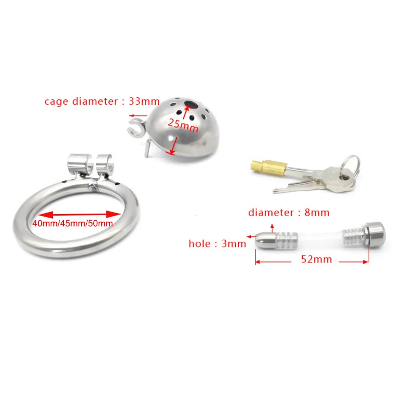Материал: нержавеющая сталь премиум-класса.Вес: около 160 г.Диаметр клетки: около 33 мм.Длина клетки: около 25 мм.Катетер уретры длиной 52 мм.Катетер уретры диаметром 8 мм.Диаметр стопорного кольца: 40 мм/45 мм/50 мм.Незаметпосылка для защиты вашей конфиденциальности.