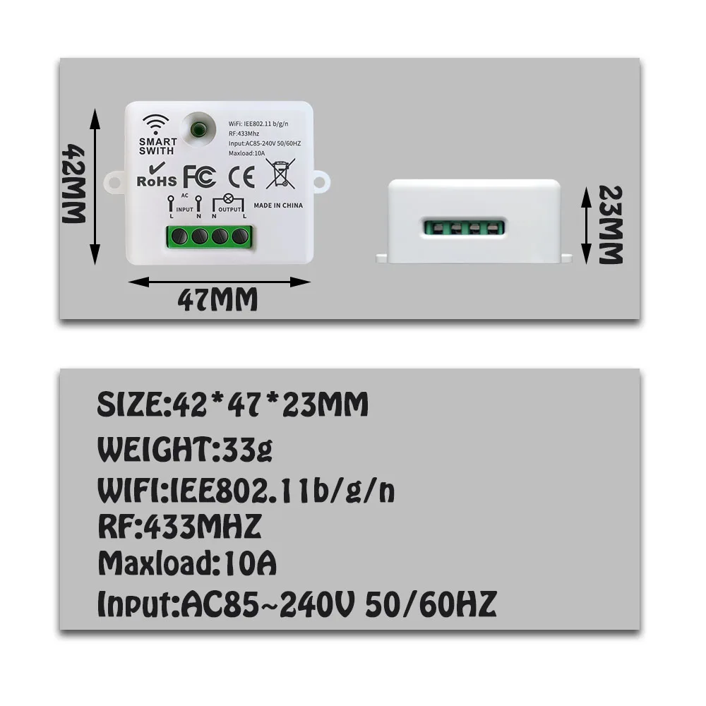Рабочее напряжение:AC85 ~ 240 ВРазмеры: 47*42*23 ммМаксимальная нагрузка:10AРежим управления:Радиочастотный пульт дистанционного управления/Управление приложением/Голосовое управлениеЧастота RF:433 МГцРабочая температура: 30 ~ + 80Чувствительность приема:97dbmКоличество пульта дистанционного управления:25 шт.Поддержка кодирования:1527 код наклона/2262 фиксированный кодРежим работы RF:Спросить Супергетеродинный беспроводной приемWi-Fi:Ieee 802,11 b/g/nСовместимость:Приложение для IOS и Android.Интеллектуальный динамик доступа:Amazon Alexa / Google homeУдаленный режим работы:Режим переключения2. Параметры передатчика стеновой панели