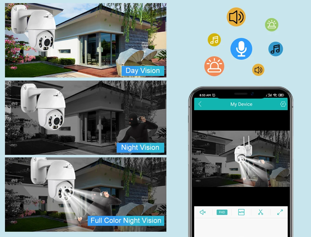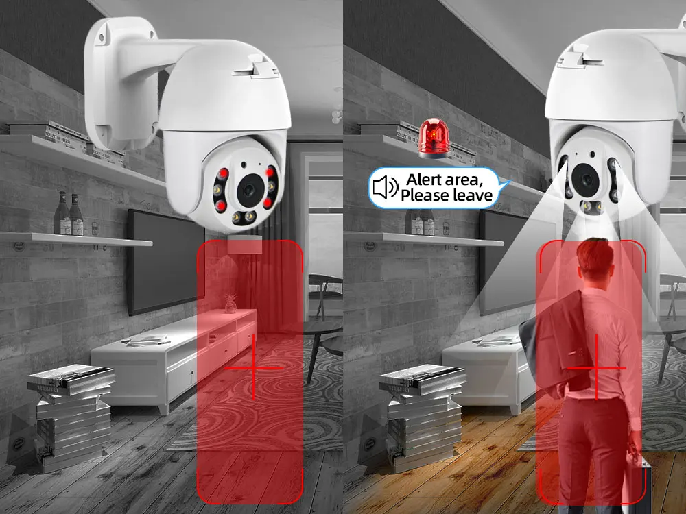 Когда кто-то ворвется в область съемки, камера сделает звуковой сигнал и сигнал тревоги будет передвинут в приложение вашего телефона. И когда он обнаруживает движение, 4 белый светодиодный светильник s будет светильник, показывая вам цвет ночной сцены.