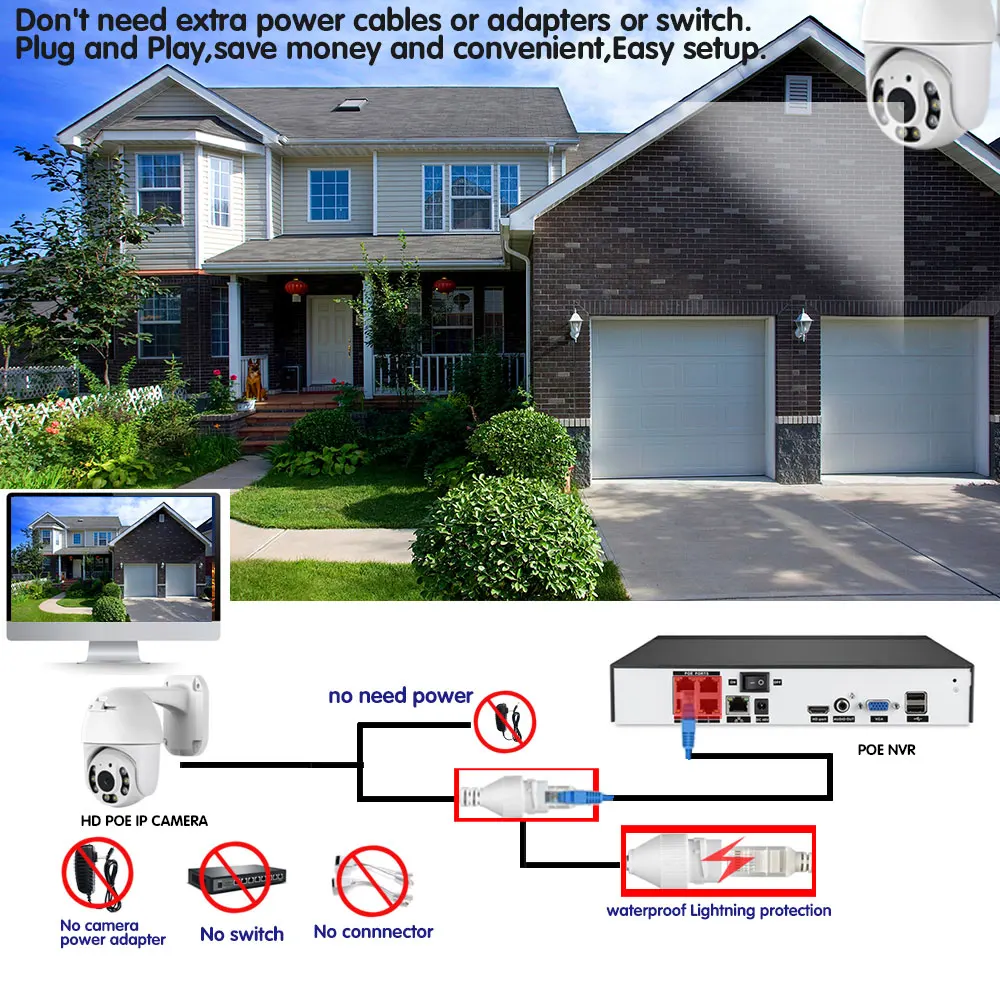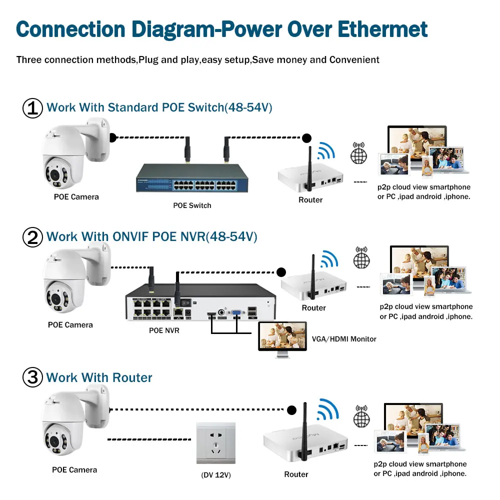 Нет дополнительных кабелей питания или адаптеров, просто подключив ip-камеру к NVR с помощью одного кабеля, вы можете легко завершить установку без знания о компьютере или сети и начать наслаждаться супер простым мониторингом среди вашего смартфона, планшета или ПК.