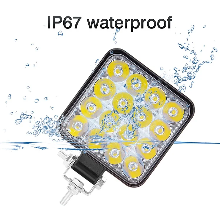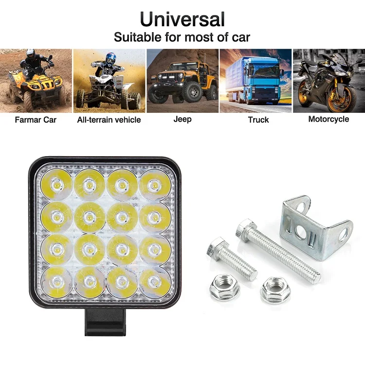 Светодиодный источник питания: 48 Вт (светодиодный индикатор высокой интенсивности 16x3 Вт) Светодиодный чип: 3030 Рисунок луча: пятно Теоретический Световой поток: 4800 лм Рабочий Световой поток: 3800 лм Входное напряжение: 9-32 В постоянного тока (подходит для транспортных средств 12 В, 24 В) Светодиодный Цветовая температура: чистый белый 6000K-6500K Степень водонепроницаемости: IP67; Водонепроницаемый, пыленепроницаемый, ударопрочный и антикоррозийный Рабочая (чип на плате) Срок службы: более 50000 часов Рабочая температура: от-40 до 85 градусов Цельсия Материал: литой алюминиевый корпус, кронштейн из нержавеющей стали, объектив из поликарбоната.
