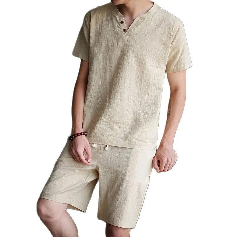 Рубашка мужская из хлопка и льна, дышащая блузка с коротким рукавом, однотонный пуловер, летняя одежда