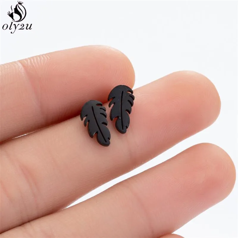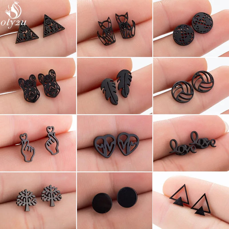 Серьги-гвоздики из нержавеющей стали для женщин и мужчин, ювелирное изделие черного цвета в стиле панк, круглые сережки с листьями, кошками, собаками, картой мира