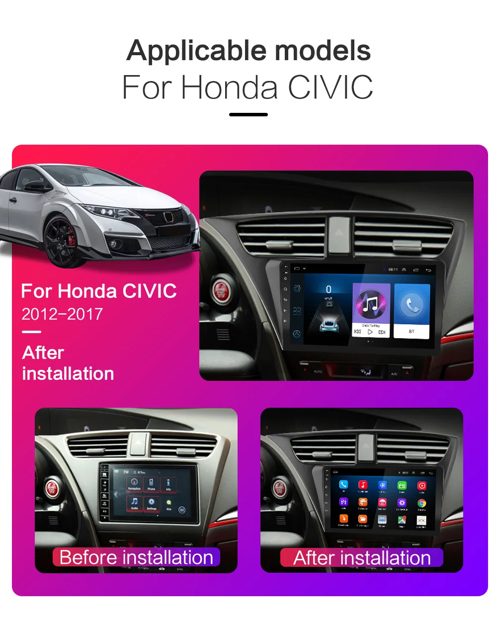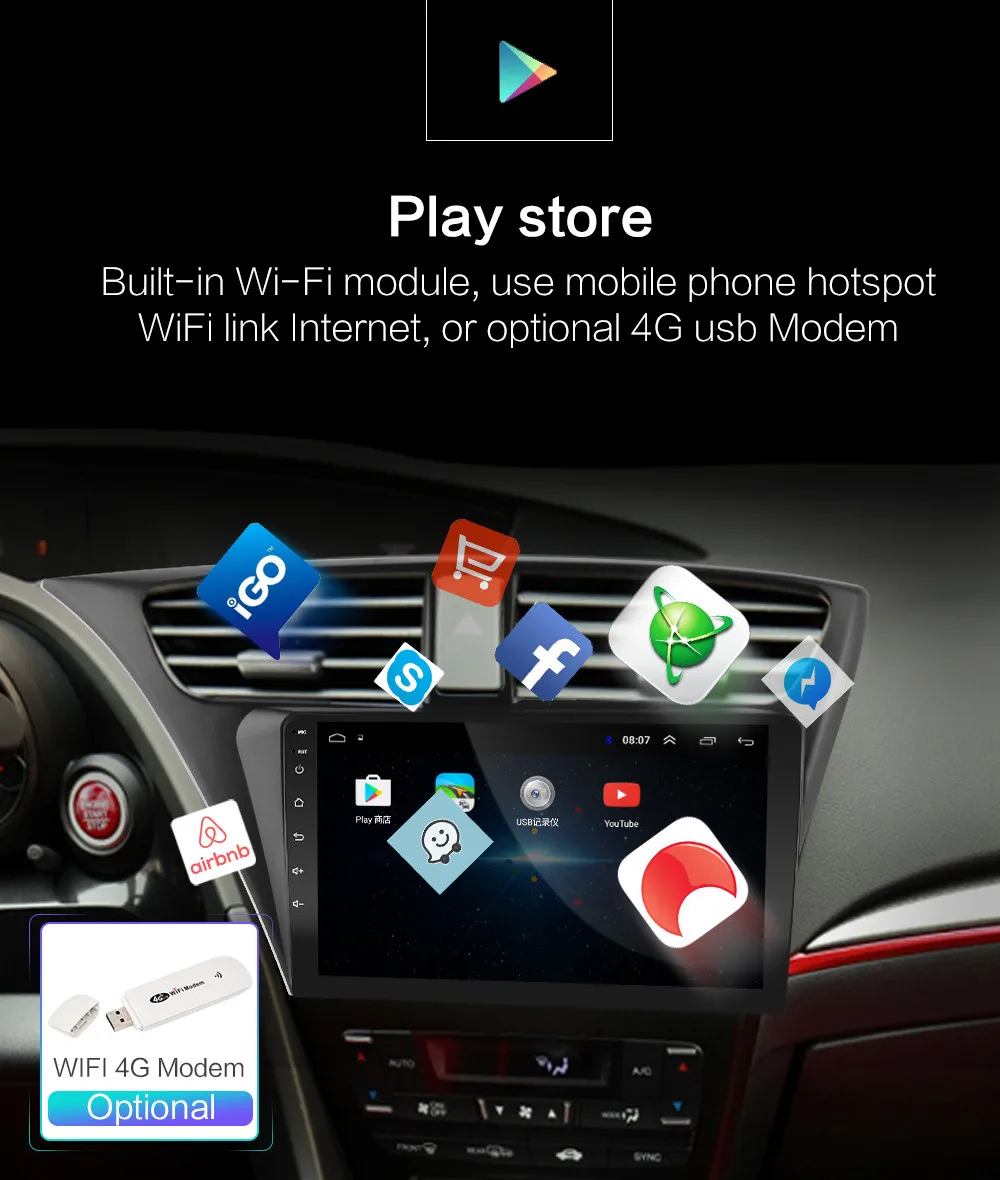 Для Honda Civic 2012 2013 2014 2015 2016 2017 (левые модели) 1, 4-х ядерный конфигурация включает в себя (Оперативная память + Встроенная память): 1 Гб + 16 ГБ/2 ГБ + 16 ГБ/2G + 32G / 4G-SIM-3560-2G + 32G [дополнительно]; 2, 8-ядерный конфигурация включает в себя (Оперативная память + Встроенная память): 7260L-2G + 32G / 7260L-4G + 64G / 4G-SIM-5760-2G + 32G / 4G-SIM-5760-4G + 64G / 4G-SIM-TS10-4G + 64G/4g-sim-ts6g на выбор + 128 3, 4-х ядерный содержит: версия: Android 8,1; Четырехъядерный процессор MTK8227 / Cortex-A7 Поддержка автомобиля logo5; Sfactory пароль: 8888 Разрешение: HD 2.5D,1024*600; Не поддерживает функцию AM, функцию RDS; Обычная посылка WiFi поддерживает функцию видеовыхода; Версия 3560-4G-SIM-WiFi: версия: Android 6,0; Поддерживает DSP; Не поддерживает функцию видеовыхода; 4, 8-Core содержат: версия: Android 9,0 или Android 10; Восемь ядер: CPU Quad core и GPU Quad core соответственно; Поддержка автомобиля logo5;Sfactory пароль: 8888; Разрешение: HD 2.5D,1024*600; Версия 7260L-WIFI: поддерживает функции DSP, сплит-экрана; Не поддерживает видеовыход; 4G-SIM-5760-WIFI и 4G-SIM-TS10-WIFI версия: поддерживает функции DSP, Carplay, сплит-экрана, слота для sim-карты 4G; Не поддерживает видеовыход; 5. Операционная система Android может установить приложение Google Play store Skype Facebook youTube Twitter и т. Д.; 6. Поддержка: радиостанция, Bluetooth Вызов, Bluetooth музыка, управление рулевым колесом, встроенный WiFi, MP3, видео музыка (MPG, AVI), навигация, видеовыход, зеркальная связь, USB 4G LTE WIFI ключ и другие функции; Поддержка OBD (опционально) Поддержка DAB + (опционально)