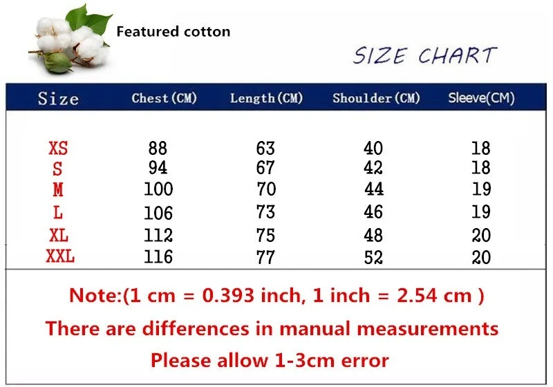 Посылка включает в себя: 1 шт. T-shirtматериал: 100% хлопок Примечание: Сравните размеры деталей с вашими, пожалуйста, позвольте 1-3 см отличается из-за ручного измерения, спасибо. Пожалуйста, перед покупкой внимательно изучите таблицу размеров, спасибо