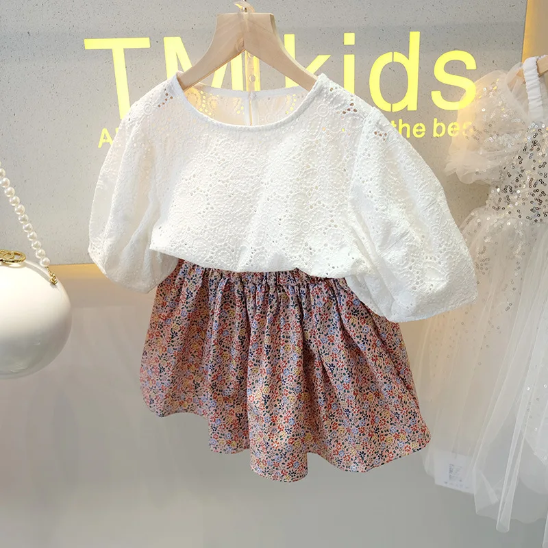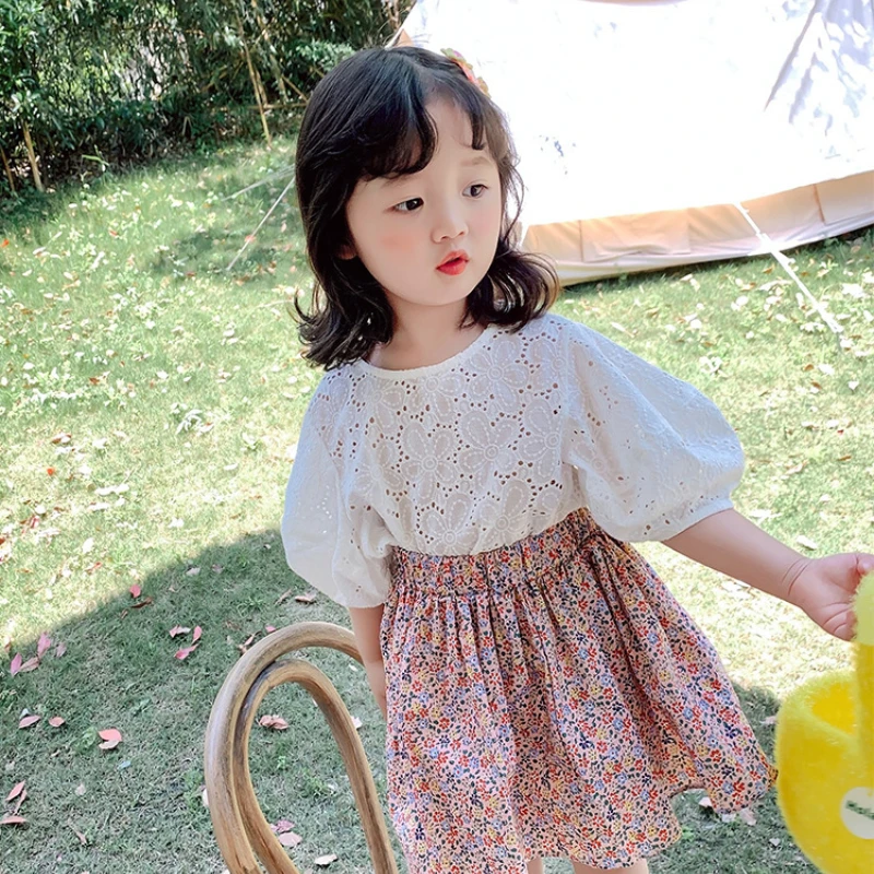 Комплекты одежды для девочек, для малышей, летняя блузка с коротким рукавом и цветочным принтом, с оборками, топы, юбка с цветами, лето, 2 шт., От 2 до 7 лет