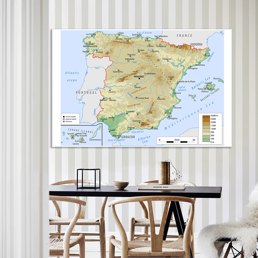 225*150 см топографическая карта Испании с важными городами, Нетканая Картина на холсте, плакат, настенное украшение для дома, школьные принадлежности
