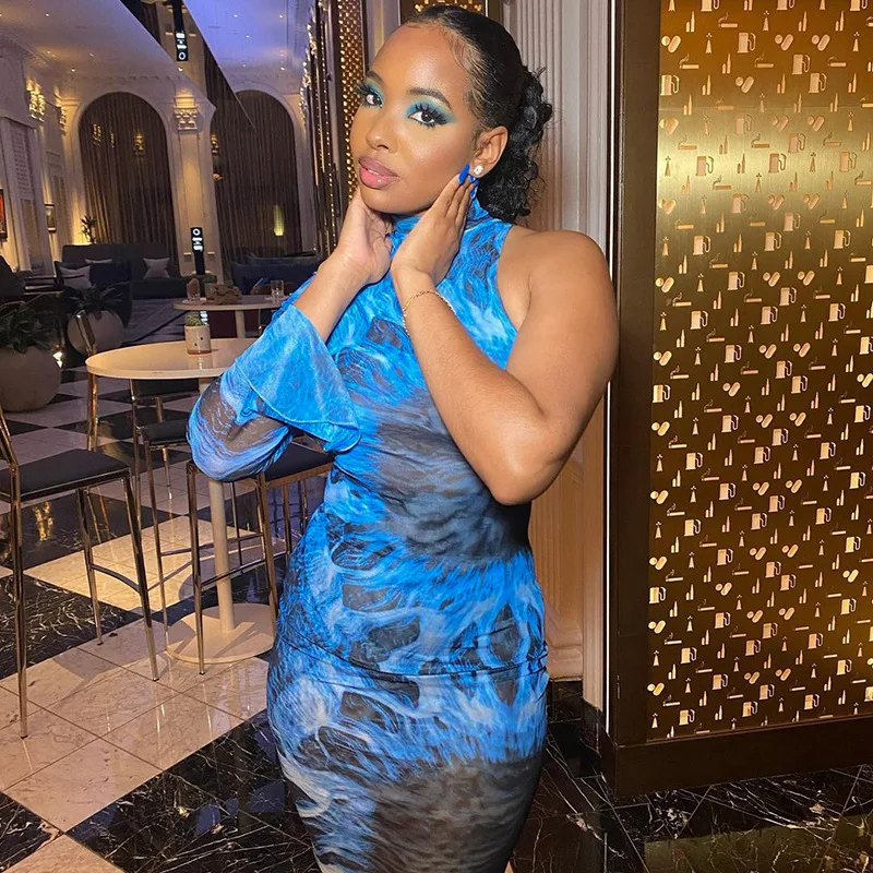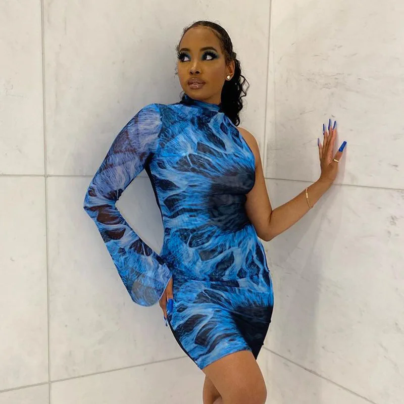 Сетчатое мини-платье на одно плечо, женские облегающие платья с синим принтом в стиле Tie Dye, летние сексуальные платья с длинным рукавом 2021 для ночного клуба, одежда для Baddie