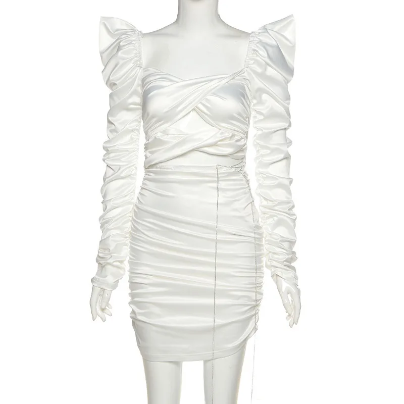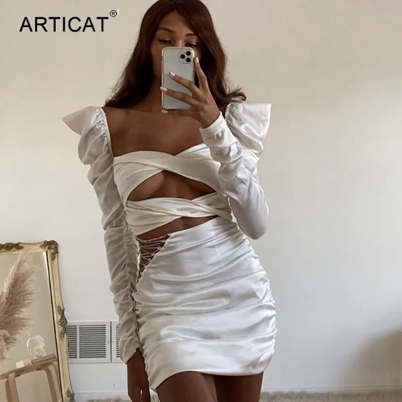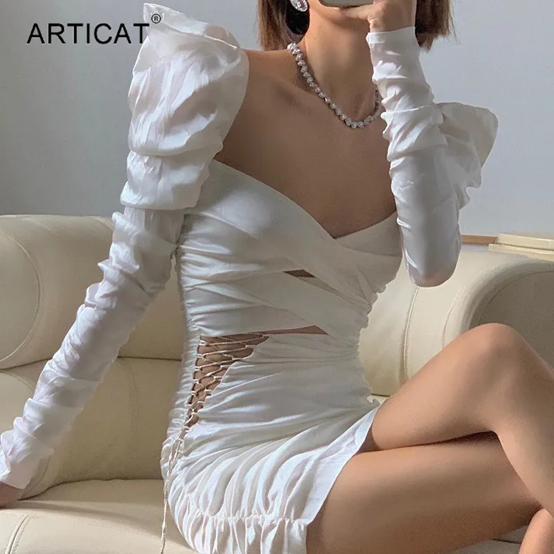 Женское платье со стразами Articat, облегающее винтажное платье с длинным рукавом, с рюшами, белое, для вечеринок