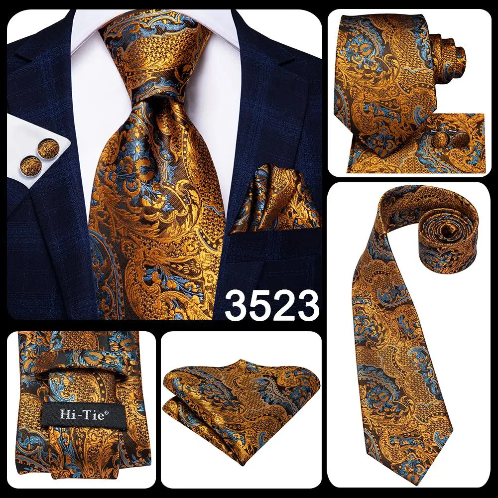 Привет-галстук 100% шелк роскошные мужские s Галстуки Цветочные черные золотистые Галстуки Пейсли галстук Карманный квадратный запонки набор мужской свадебный галстук