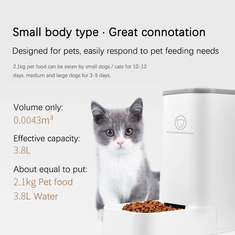 Автоматическая кормушка для домашних животных большой емкости для собак и кошекВся съемная конструкция легко моется-Съемное ведро для хранения, внутреннюю конструкцию можно снимать и мыть один за другим, безопасно для здоровья домашних животных. -Верхнюю крышку кормушки можно снять, удобная поставка-экологически чистый полипропиленовый полимерный материал, безопасный и без запахаНебольшая оптимизированная конструкция для формы тела экономит место большая коннотация-предназначена для домашних животных, она более изыскана и компактна, чем когда-либо, охватывая площадь 0,045 м² меньше, чем бумага формата А4. Но все же хранит 3,8 л воды/2,1 кг сухого корма для домашних животных. -2,1 кг сухой корм для животных для маленьких собак/кошек на 10-12 дней, средних собак на 3-5 днейНепрозрачный дизайн защищает его от свежести-сухой корм для животных необходимо держать вдали светильник и защищать от прямого солнечного света. Пища более свежая, а домашние животные более здоровые. -Проход еды не заблокирован, вкусняшки не опаздывают. -Когда вы путешествуете на короткие расстояния, выходите в свет, или в командировке чувствуете себя более непринужденно.Теплые подсказки:Чтобы ваши питомцы были здоровее, рекомендуется часто мыть миску и менять корм/воду и регулярно кормить собаку в фиксированном количестве.Спецификация:Цвет: белыйМатериал: Экологически чистая полипропиленовая смолаИспользование: кошки и собакиЕмкость: питатель воды 3,8 л (вода)Кормушка 2,1 кг (сухой корм для животных еда)Комплектация:1 x автоматическая кормушка для домашних животных