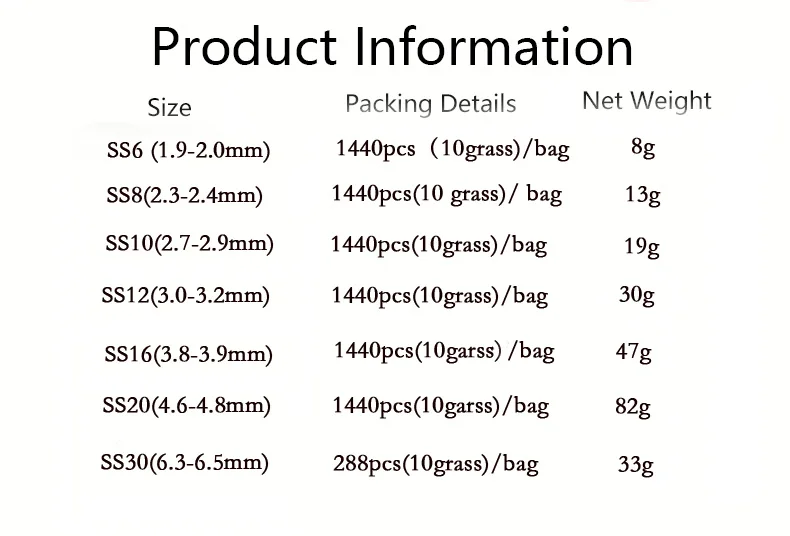 Strass Hotfix Small Packing1440pcs From ss3 To ss 20| 288Pcs For ss30 ss34| 144Pcs for ss40