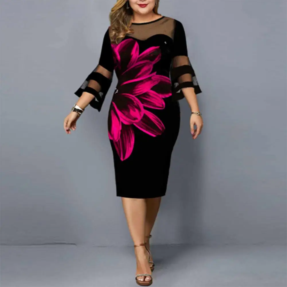 Размера плюс, летнее платье, сексуальные женские платья, 34 в стиле пэчворк с сетчатой тканью, с длинными рукавами, Цветочный принт облегающее платье бодикон длиной до колена платье для вечерние