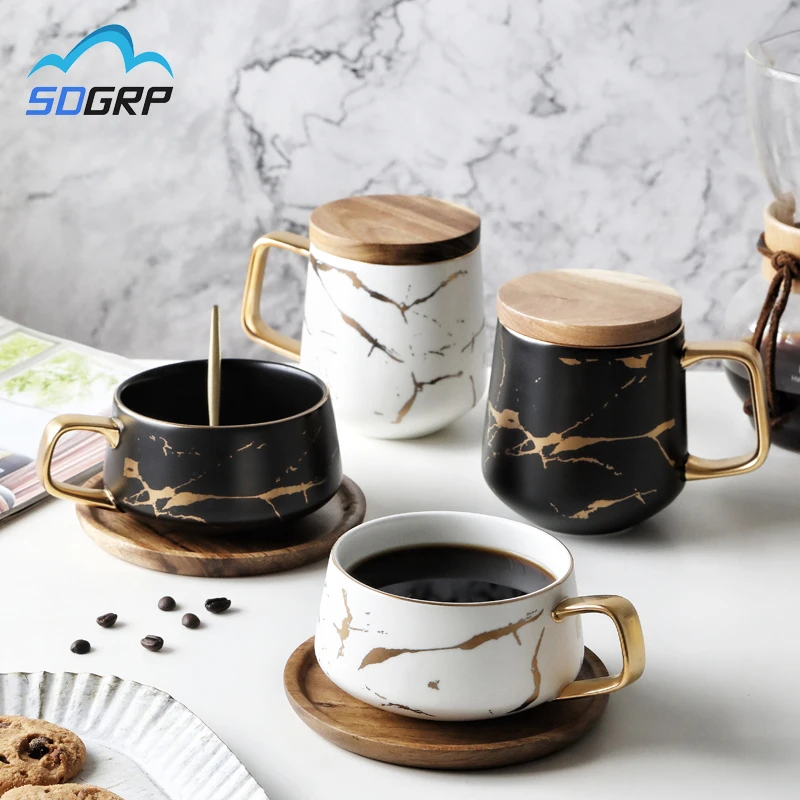Керамическая кружка в скандинавском стиле с креативной мраморной текстурой, позолоченная ручка, кружка, деревянная крышка для блюдце, кофейная чашка, кружка для завтрака и молока, ремесла