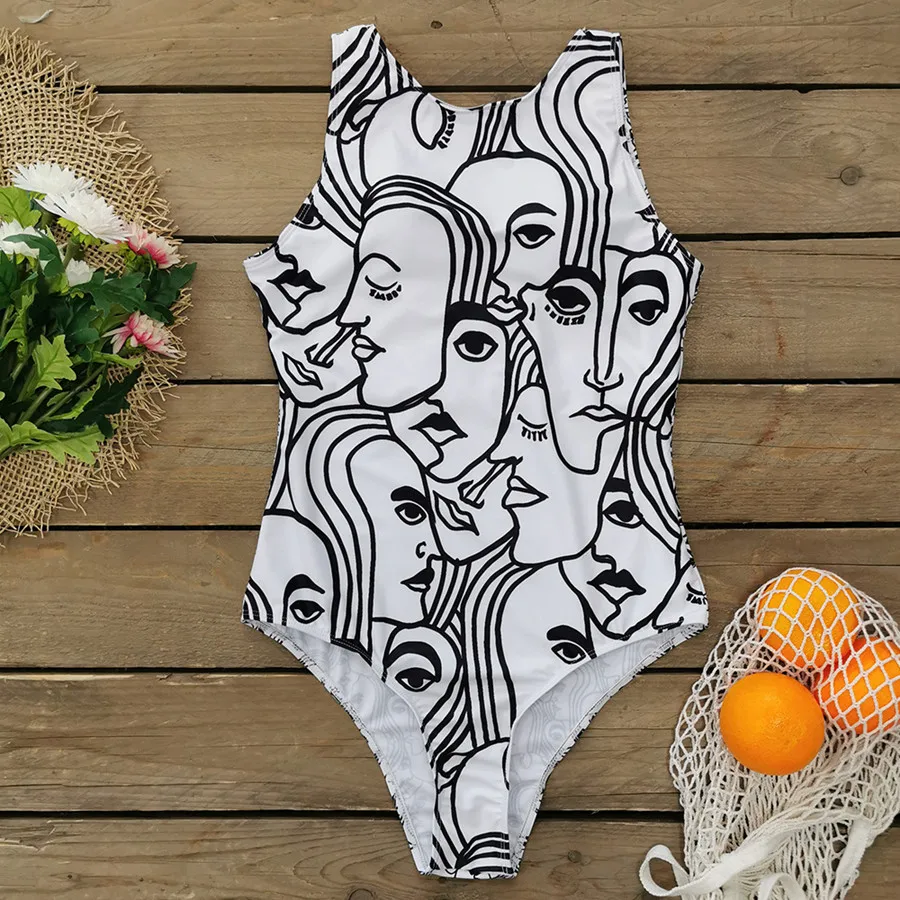 Винтажный слитный купальник с абстрактным принтом лица, женское бик...