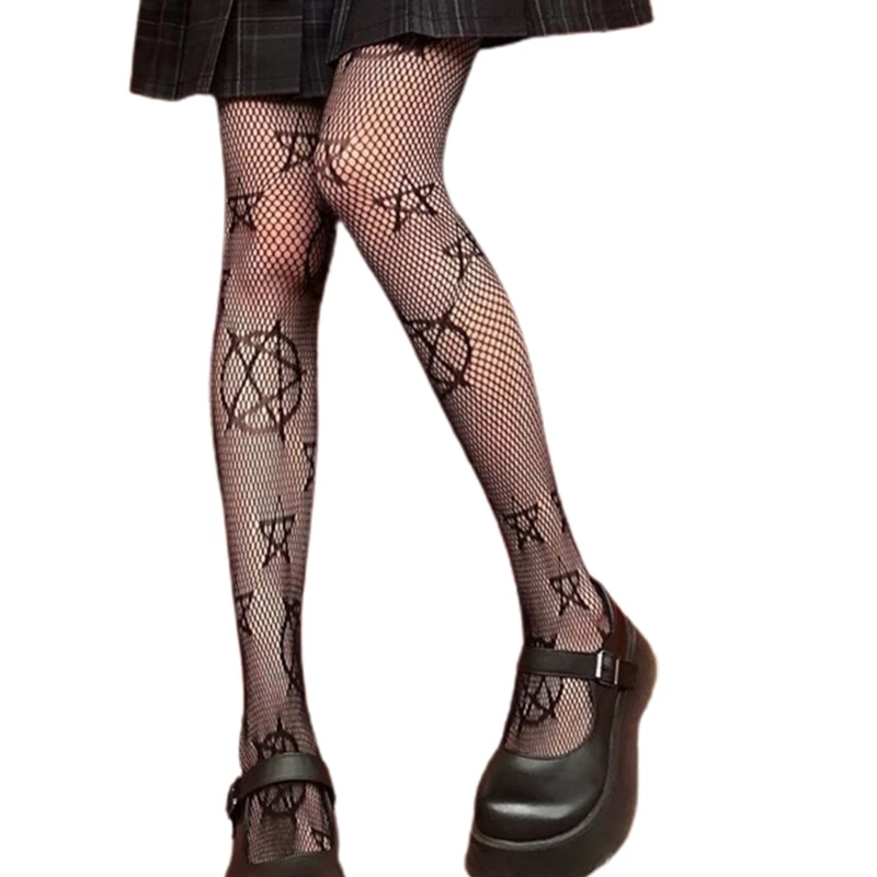 Готический панк стиль, ажурные сетчатые колготки, винтажный волшебный пятиконечный звездный узор жаккард.