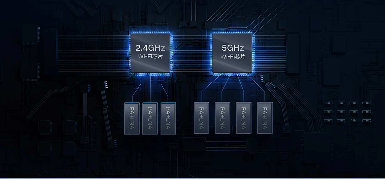 2,4 ГГц и 5 ГГц полосы поддерживаются отдельно по 3 и 4 независимых высокопроизводительный усилители сигнала (PA + LNA) для лучшего проникновения через стены. Двухдиапазонный WiFi легко обеспечивает покрытие даже для больших домов. PA (усилитель мощности) эффективно усиливает мощность передачи сигнала, в то время как LNA (усилитель с низким уровнем шума) может повысить чувствительность приемника сигнала.