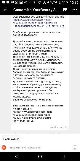 Этот продавец обманщик! Сначала вымогал доплату за доставку, потом, по отработанной уже на Али схеме, дал чужой номер отслеживания. Потом резко перестал понимать русский, хотя все сообщения автоматом переводятся. Спор открыт через службу поддержки.
