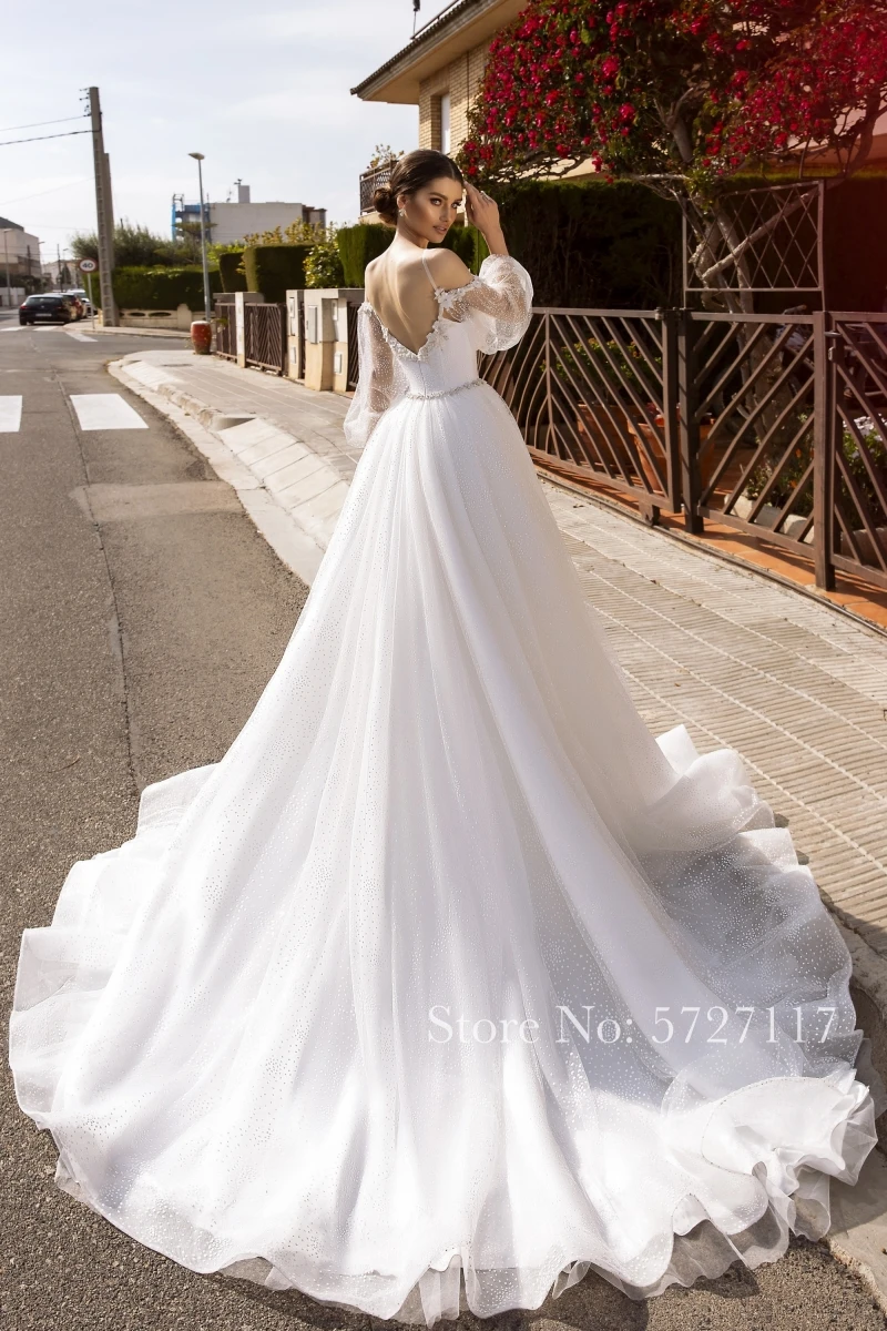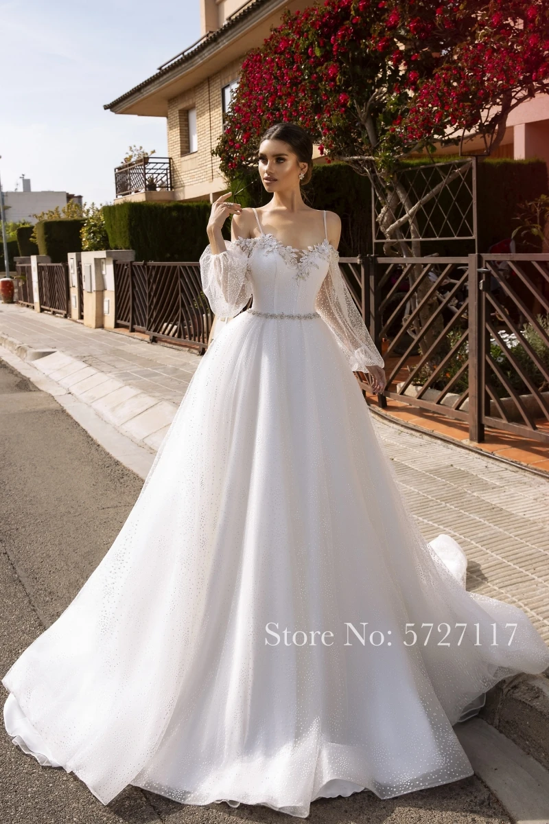 Богемное свадебное платье А-силуэт на тонких бретелях Фонари рукава Аппликация с узором в горошек из Тюля Пол Длина поезд невесты 2021