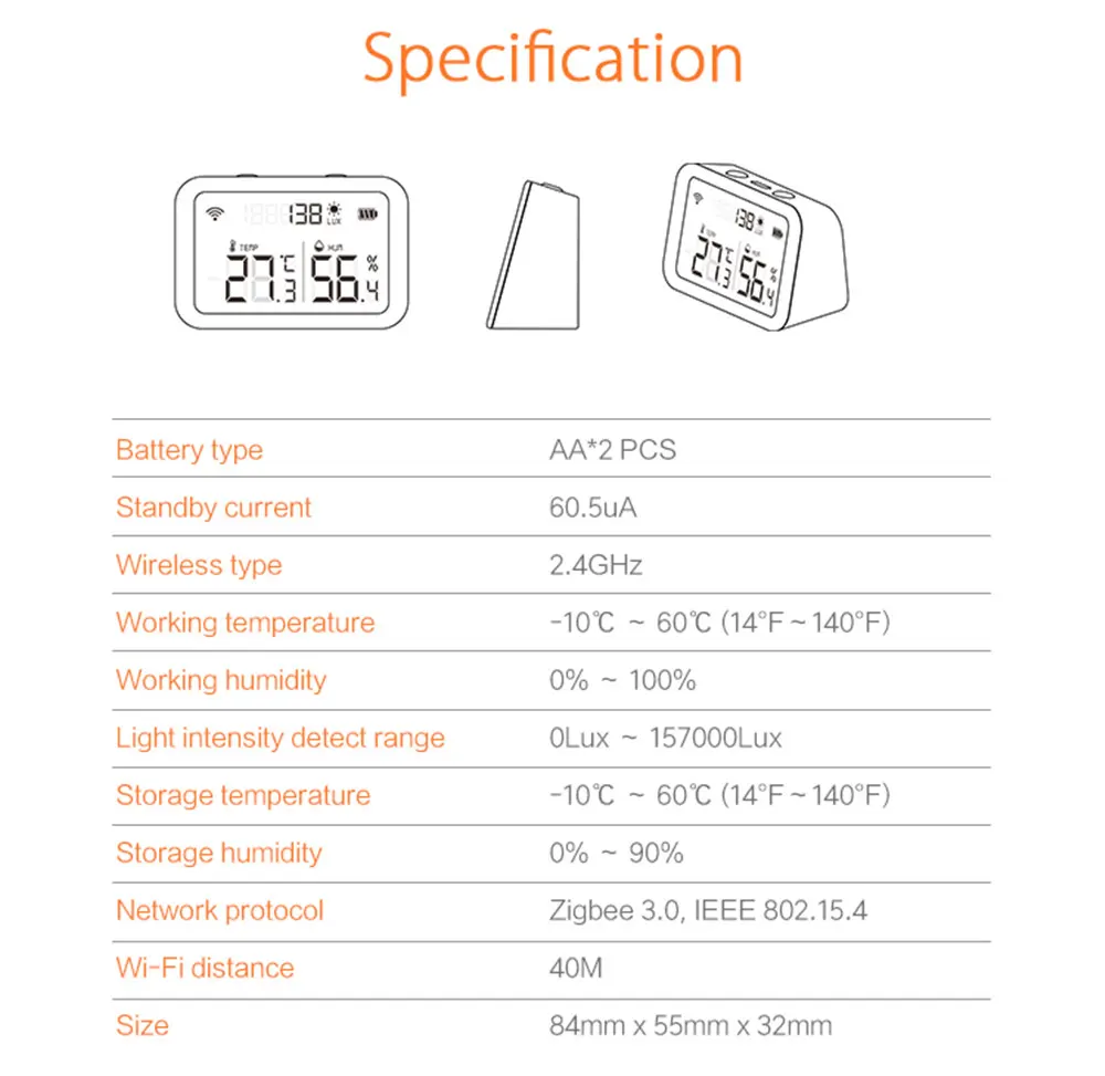 Название продукта: датчик температуры и влажности (версия ZigBee)Приложение: Smart Life/Tuya SmartТип батареи: AA батарея * 2 шт. (батарея в комплект не входит)Сетевой протокол: ZigBee 3,0, IEEE 802.15.4Беспроводной Тип: 2,4 ГГцРабочая температура:-10-60 ℃(14 ℉-140 ℃)Рабочая влажность: 0%-100%Светильник интенсивность Дальность обнаружения: 0-157000LuxТемпература хранения:-10-60 ℃(14 ℉-140 ℃)Влажность хранения: 0%-90%Размер изделия: 84*55*32 мм