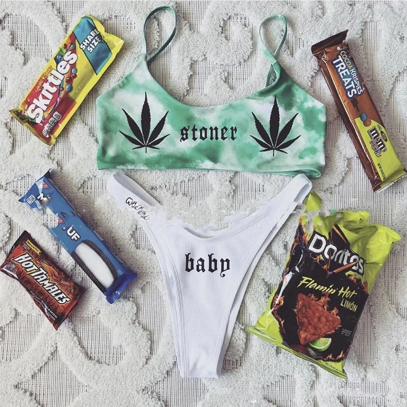 Женский купальный костюм с принтом букв, короткая кофта с U-образным вырезом и трусики бикини на лето