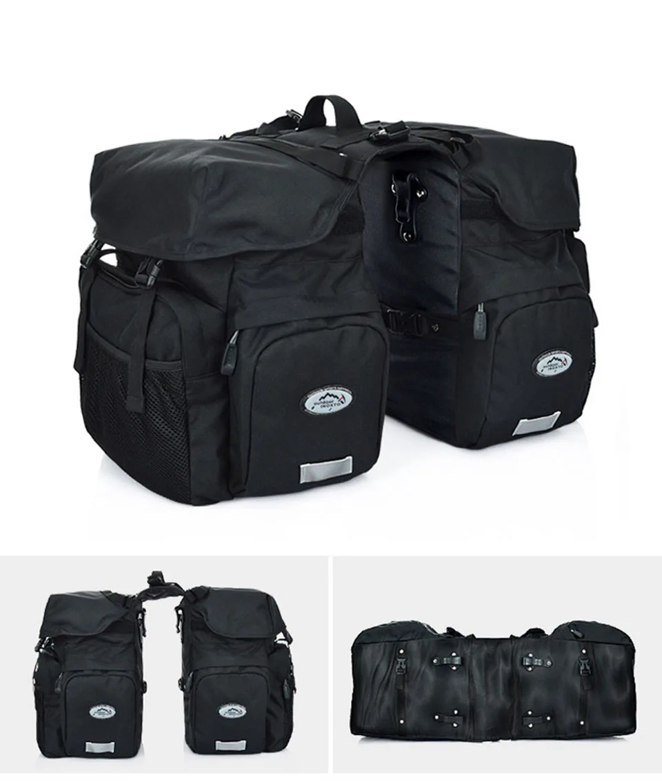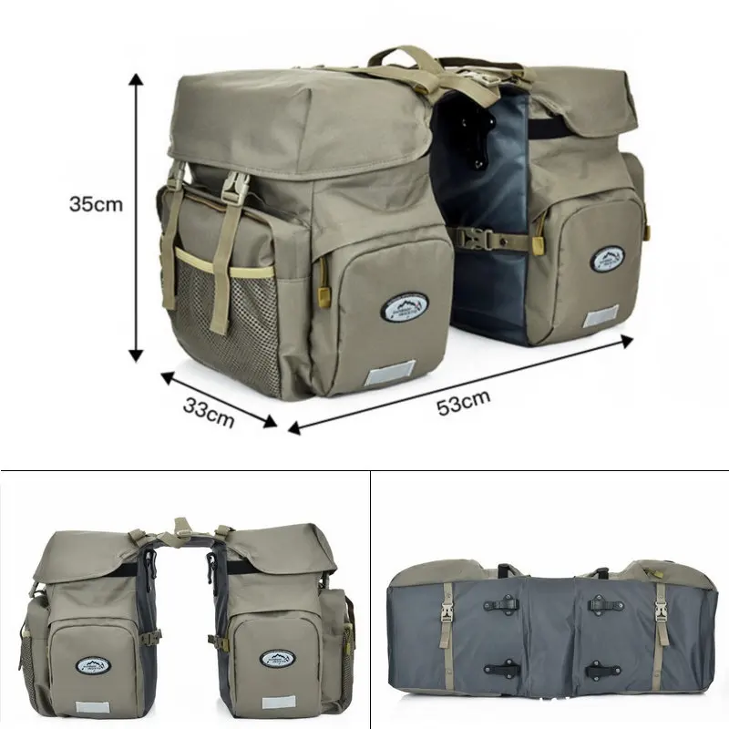 Особенности: 1. Стильный дизайн для удовлетворения многократных потребностей, больше карманов и большая емкость 50L -- Набор велосипедных мешков с двумя панелями соединены средней полкой, два штанов не могут быть разделены. -- Каждый Паньер имеет большое основное отделение, передний карман с сеткой и боковой карман. -- Основной отсек Регулируемый Чехол оснащен клейкой липучкой двусторонней лентой и 2 пряжками для более свободной загрузки большего количества вещей. -- Карманы оснащены прочными молниями, все молнии покрыты, чтобы помочь держать грязь и воду из молний сумки. -- Верхний пояс на мешке pannier позволяет больше места для дополнительных сумок на багажнике сверху или рюкзаке, палатке, спальном мешке и так далее. 2. Простота установки и стабильность. -4 быстроустанавливаемых крючка и 4 крепежных ремня с пряжками облегчают установку штанов и прикрепляют их к носителю. 3. Водонепроницаемый материал с дополнительным дождевиком. -- С использованием высокоплотного усиленного полиэстера с полиуретановым покрытием. -- Основной отсек имеет дополнительный слой внутри с водонепроницаемой нейлоновой тканью обеспечивает большую защиту. -Поставляется с дополнительным дождевым покрытием, не бойтесь дождя. 4. Светоотражающие элементы повышают безопасность в ночное время. Охранные напоминание логотип бренда и светоотражающая лента 3M планки для улучшения видимости в ночное время. 5. Сборка в полиэтиленовой доске для уменьшения ударов и сохранения формы. Характеристики: Материал: Водостойкий усиленный полиэстер с полиуретановым покрытием нейлон Крепление: быстрая установка крючков + крепежные ремни с пряжками Дождевик: Да Емкость: 50 л Вес: 2,98lbs/1,35 кг Размеры: над рулоном Размер 20,9 'l x 13,0' w x 13,8 ''D / 53x33x35cm Вес нагрузки: выдерживает до 77 фунтов/35 кг Ширина между 2 панелями: 7 дюймов