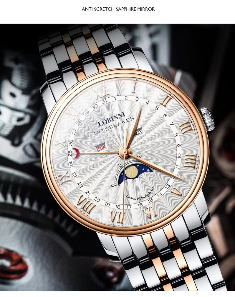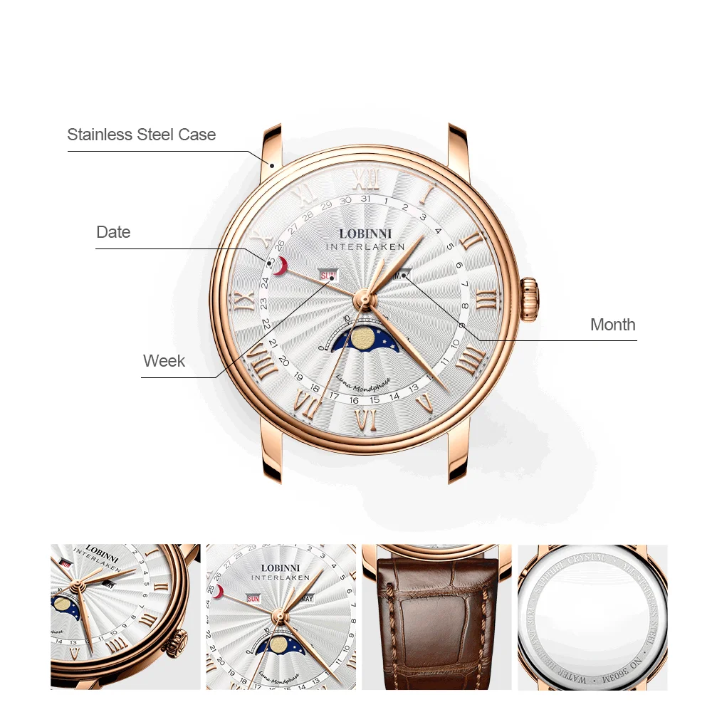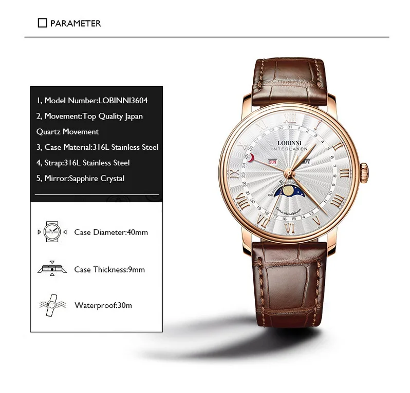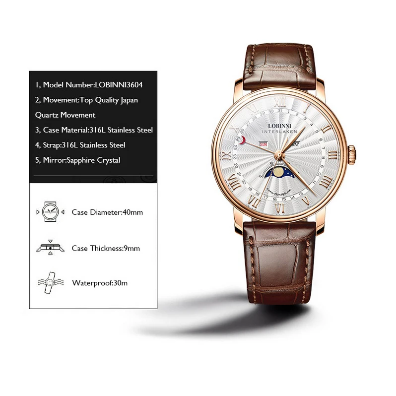 Часы наручные LOBINNI Мужские кварцевые, модные роскошные брендовые водонепроницаемые с сапфировым зеркальным стеклом, месяц недели