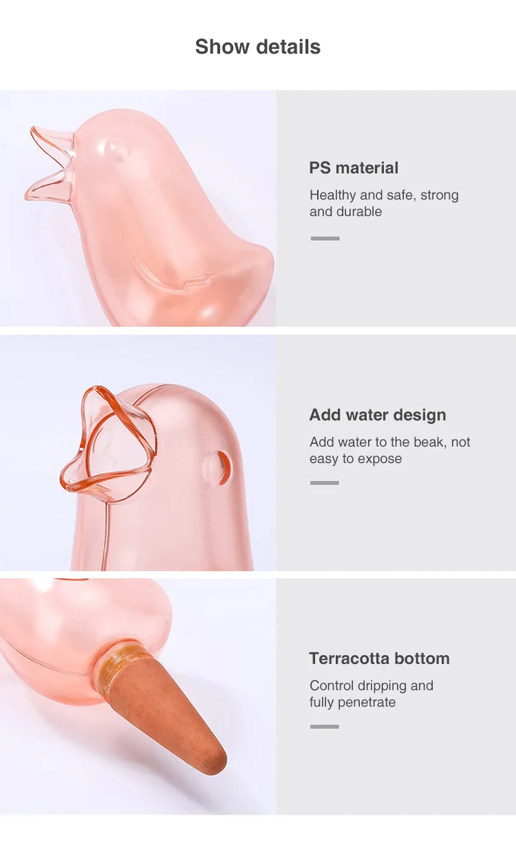Введение продуктаМатериал: PS + красная керамикаНаименование товара: прозрачная Автоматическая капельница с чайником для полива в форме птицыРазмер изделия: 16,6*7 см
