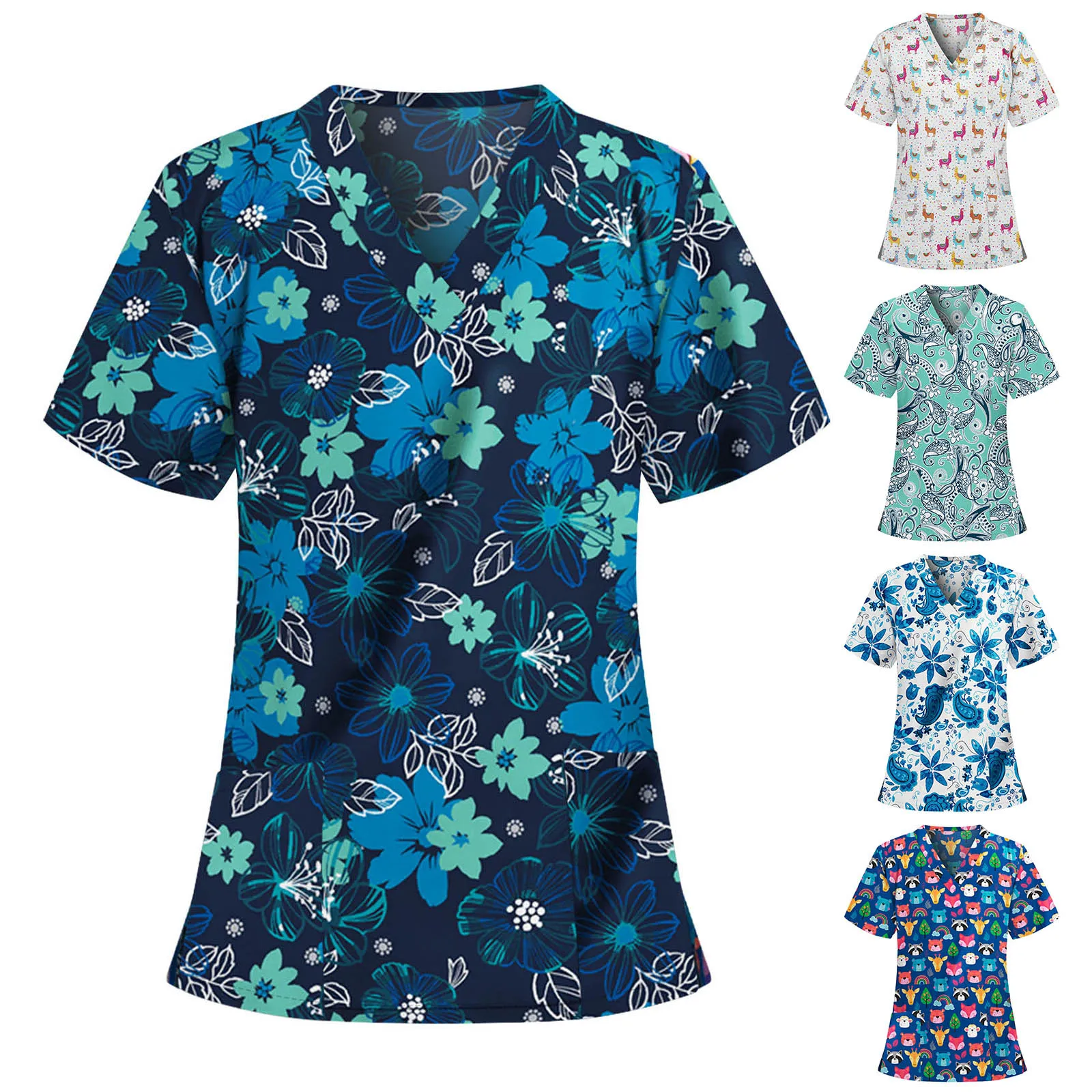 Короткий рукав V-образный вырез скраб-топ клиника медсестра Рабочая Униформа мультфильм печать салон красоты зоомагазин Рабочая одежда мужская одежда Уход