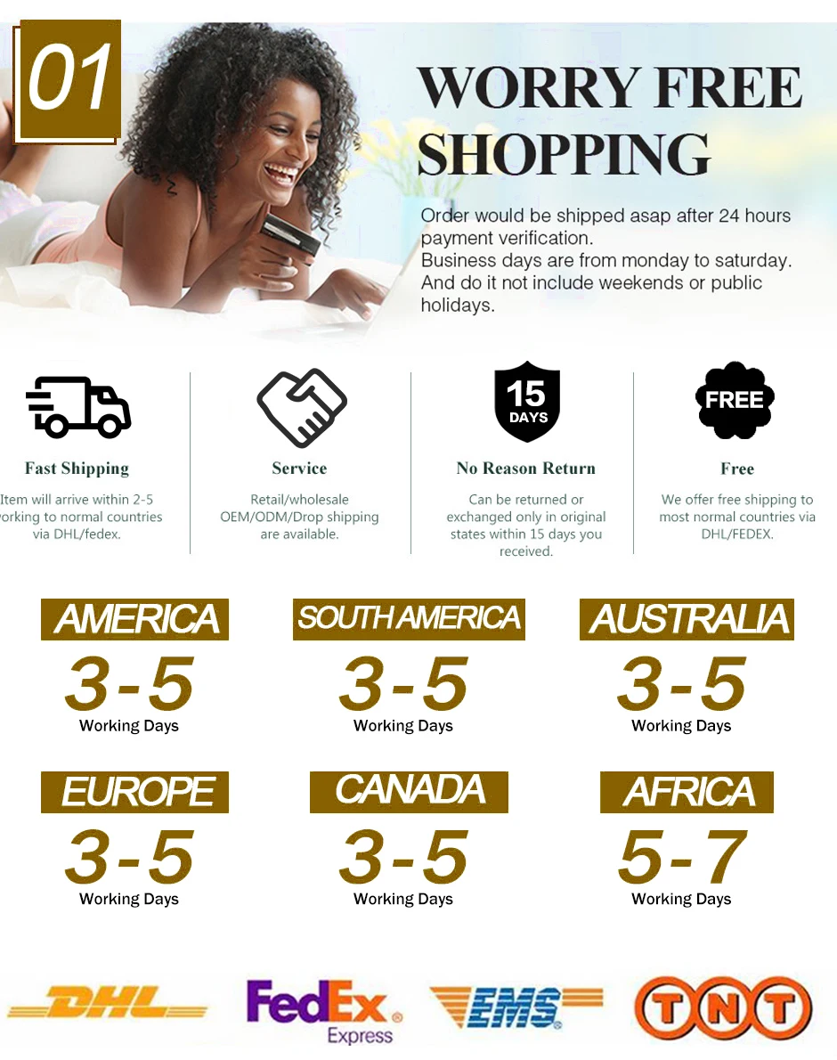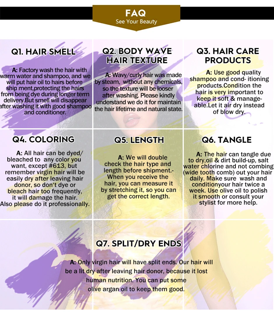 1. Встряхните пряди, вынимая посылка, и Повесьте ее на некоторое время, локоны будут тугими и естественными, они будут красивее, чем раньше. 2. Все человеческие пряди и фронтальные волосы имеют минимальное Выпадение и запутывание, что является нормальным, пожалуйста, позаботьтесь о стирке и обслуживании. 3. Если вы хотите покрасить парик, мы рекомендуем профессиональный стилист для окрашивания волос или покрасить волосы в парикмахерскую, после окрашивания волосы легко сохнут и запутываются, поэтому не окрашивайте и не отбеливать волосы слишком часто, Это навредит волосам, а также, пожалуйста, сделайте это профессионально. 4. Как мыть парик? 1) расчешите волосы, чтобы избежать запутывания. Выньте колпачок парика и положите его в воду по Фаренгейту 95-104, добавив шампунь в воду, аккуратно Вымойте волосы в течение 10-15 минут, пока он не станет худым. Не трите руками. 2) тщательно нанесите шампунь на краску и потяните кондиционер в воду. Равномерно размешать. Оставьте парик в кондиционере на 10-15 минут. 3) тщательно подготовьте краску и используйте полотенце для впитывания воды. 4) поверните крышку парика назад. Для прямого парика выберите расческу с широкими зубцами. Для волнистых париков удерживайте шапку вручную, встряхните ее 5- 6 раз, мягко бегайте пальцами. Поместите парик на модель парика и дайте ему высохнуть на воздухе.