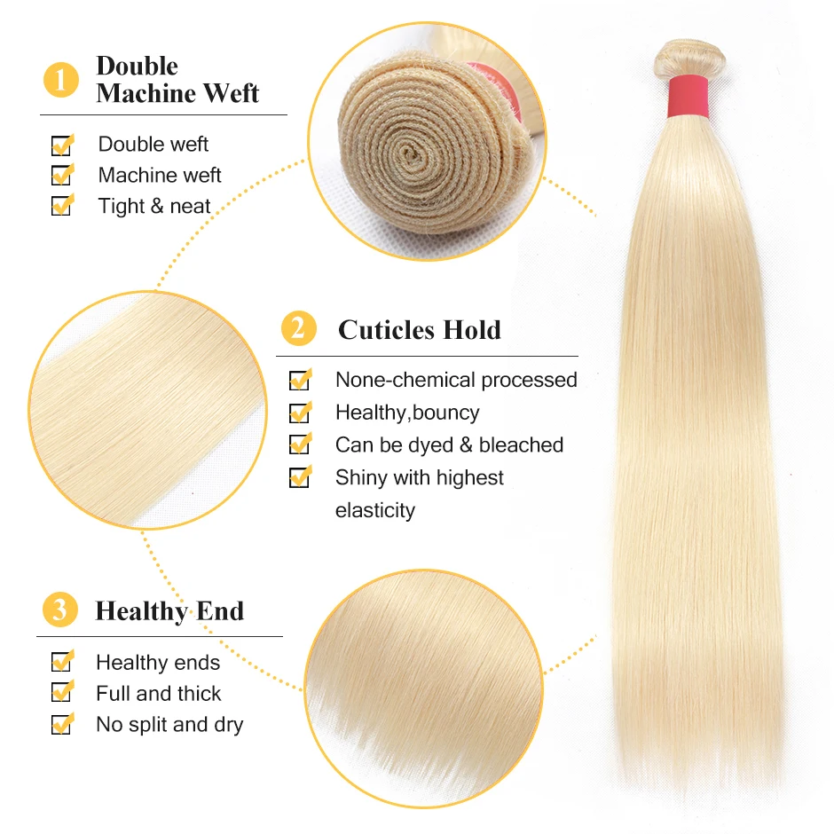 Бренд: глянцевый Текстура волос: прямая Цвет волос: 613 медовый блонд Уток волос: изысканный верхний уток, двойной машинный уток. Длина волос: в наличии Пряди 10-30 дюймов, длина смешивания. Материал волос: 100% Необработанные бразильские Виргинские прямые волосы с фронтальным кружевом и пряди. Качество волос: не линяет, не запутывается, не мнется, не секутся, не химикаты, мягкие и толстые. Сопутствующие товары: перуанские/малазийские/индийские/монгольские/бразильские девственные волосы и т. Д.