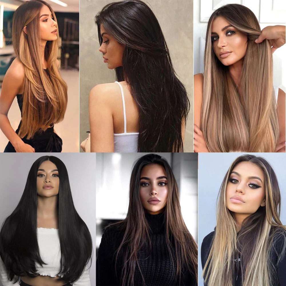 Длинные прямые волосы AMIEEGIRL на 5 заколках для наращивания, термостойкие прямые синтетические волосы, Черные накладные волосы