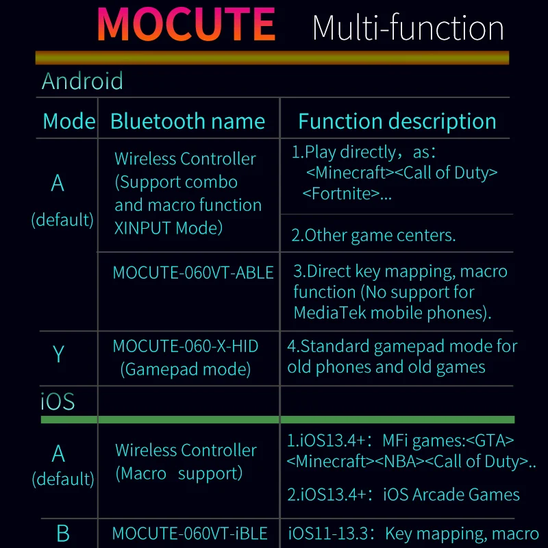 Особенности: 1. Изготовлен из высококачественного материала, очень прочный. 2. Эргономичный дизайн для комфортной и приятной игры. 3. Поддержка Android 13,4 выше, IOS 13,4 и для Windows operate sysytem и так далее. 4. Встроенный беспроводной Bluetooth 2,0-5,2, может поддерживать 2-10 метров широкий диапазон управления от операции. 5. Встроенный литиевый аккумулятор, после зарядки, он может быть устойчивым в течение 40 часов, безопасным и стабильным. 6. Используется для мобильный телефон, ПК и т. Д. 7. Гибкость, точность, комфорт, Простота Управления, компактный и портативный. 8. Поддерживает подавляющее большинство игр: Спецификация: Модель продукта: MOCUTE-060 Беспроводной протокол: Двойной режим Bluetooth, совместим с 2,0-5,2 Беспроводное расстояние: 2-10 метров Система поддержки: для IOS/ANDROID/WINDOWS Размер изделия: 226 × 90 × 46 мм Поддержка размера телефона Длина: <185 мм Перезаряжаемая батарея: 400мА литиевая батарея Время использования: WC40/BLE160 часов ЦП: ARM968E-SCore Ток Отключения: 9uA