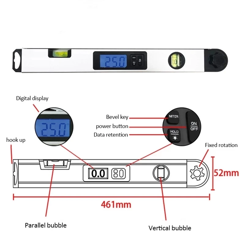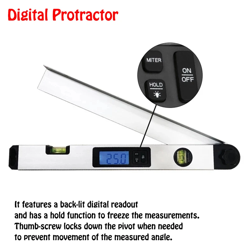 Этот цифровой искатель угла, с ЖК-дисплеем и синим задним светильник, он может видеть измеренную запись при многих обстоятельствах. Этот широкий диапазон измерения (0-230 °) и высокая точность (± 0,5 °) угол датчика позволяет вам работать с эффективностью и создадут ощущение комфорта. Более того, просто перенести miltre угол для вашей торцевой/скользящей пилы, нажав клавишу MITER. Корпус транспортира изготовлен из алюминия, который прочный и долговечный, подходит для сложной рабочей среды.