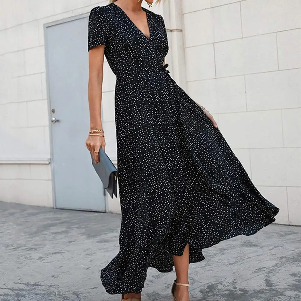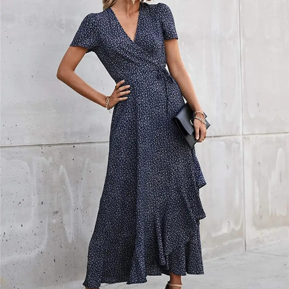Женское платье макси с цветочным принтом, V-образным вырезом, оборками, коротким рукавом, с запахом, летнее пляжное платье, купальники женские 2021