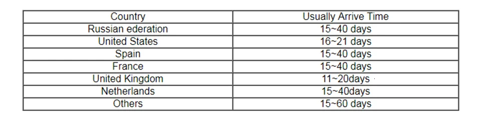 Мы используем EMS /AliExpress Стандартная доставка/Почта Китая авиапочтой/CPAM/Fedex в соответствии с вашим местоположением, и вы получите номер отслеживания в течение 1-5 дней после доставки.Мы делаем это в сотрудничестве с крупными поставщиками логистики, такими как Singapore Post, Correos, Posti Finland, SPSR, DHL и другими. Если вам нужно, пожалуйста, свяжитесь с нами, чтобы выбрать.