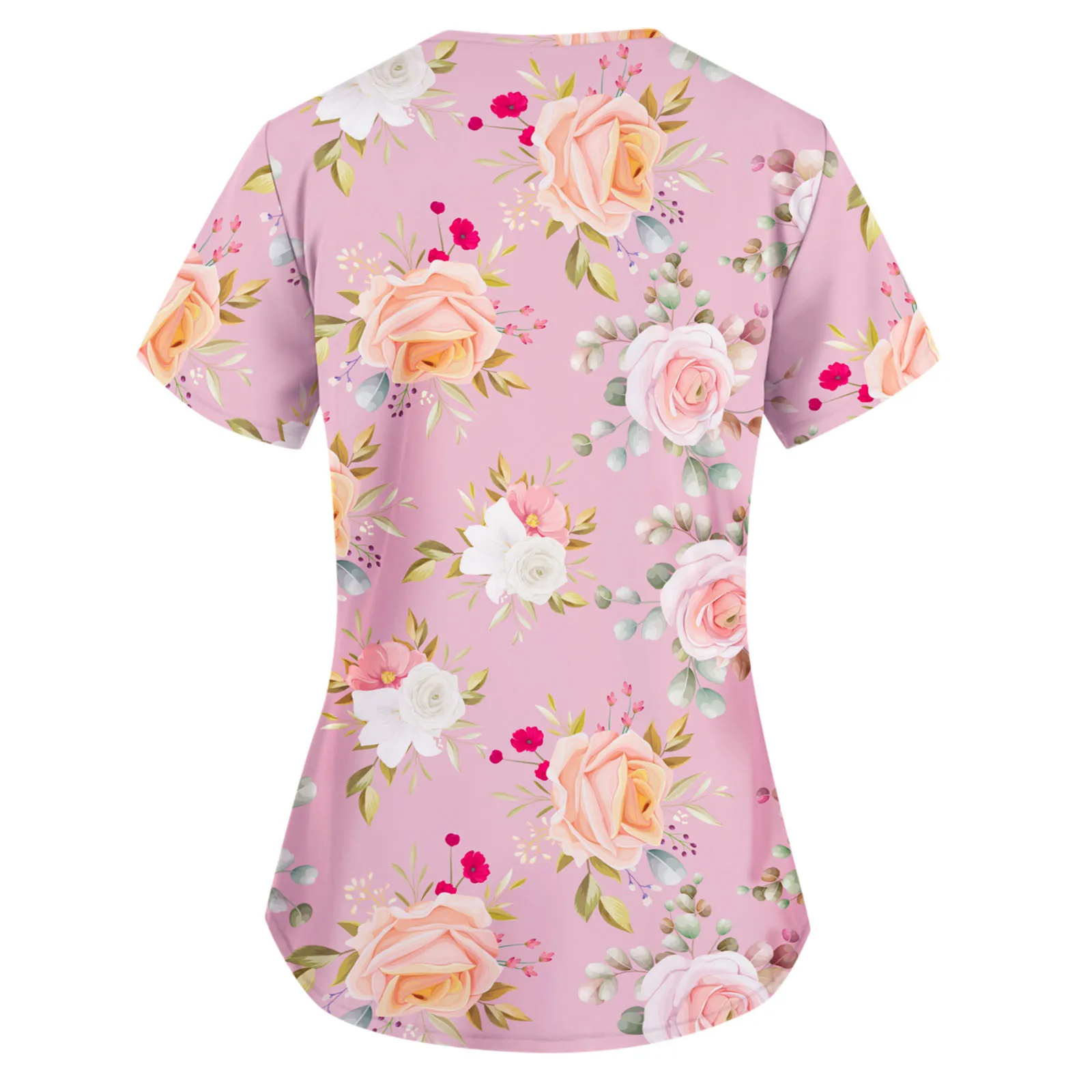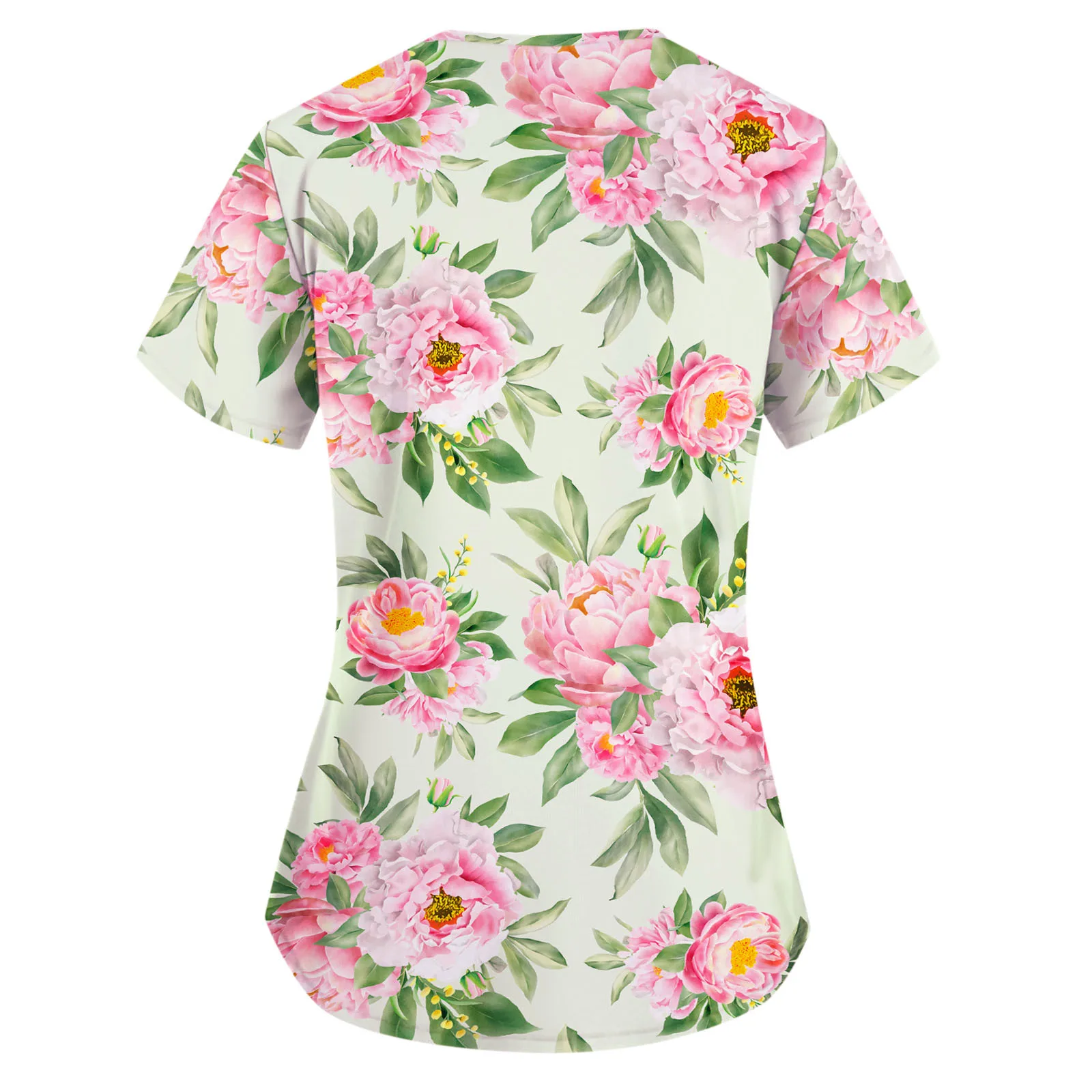 Скраб-Топ женский летний с V-образным вырезом и цветочным принтом