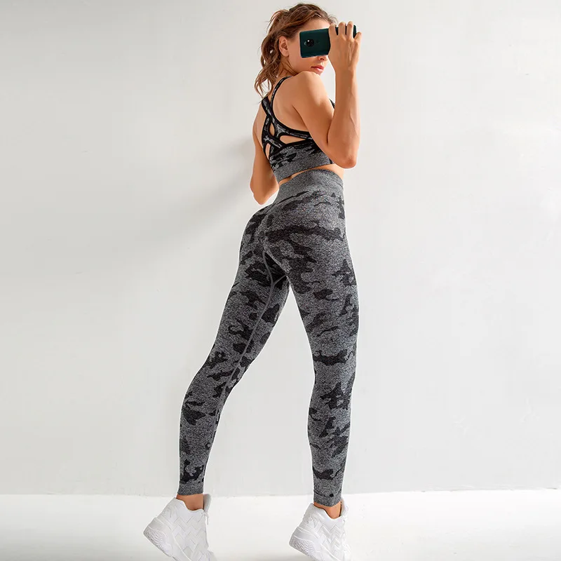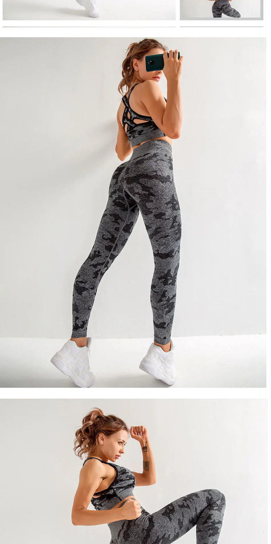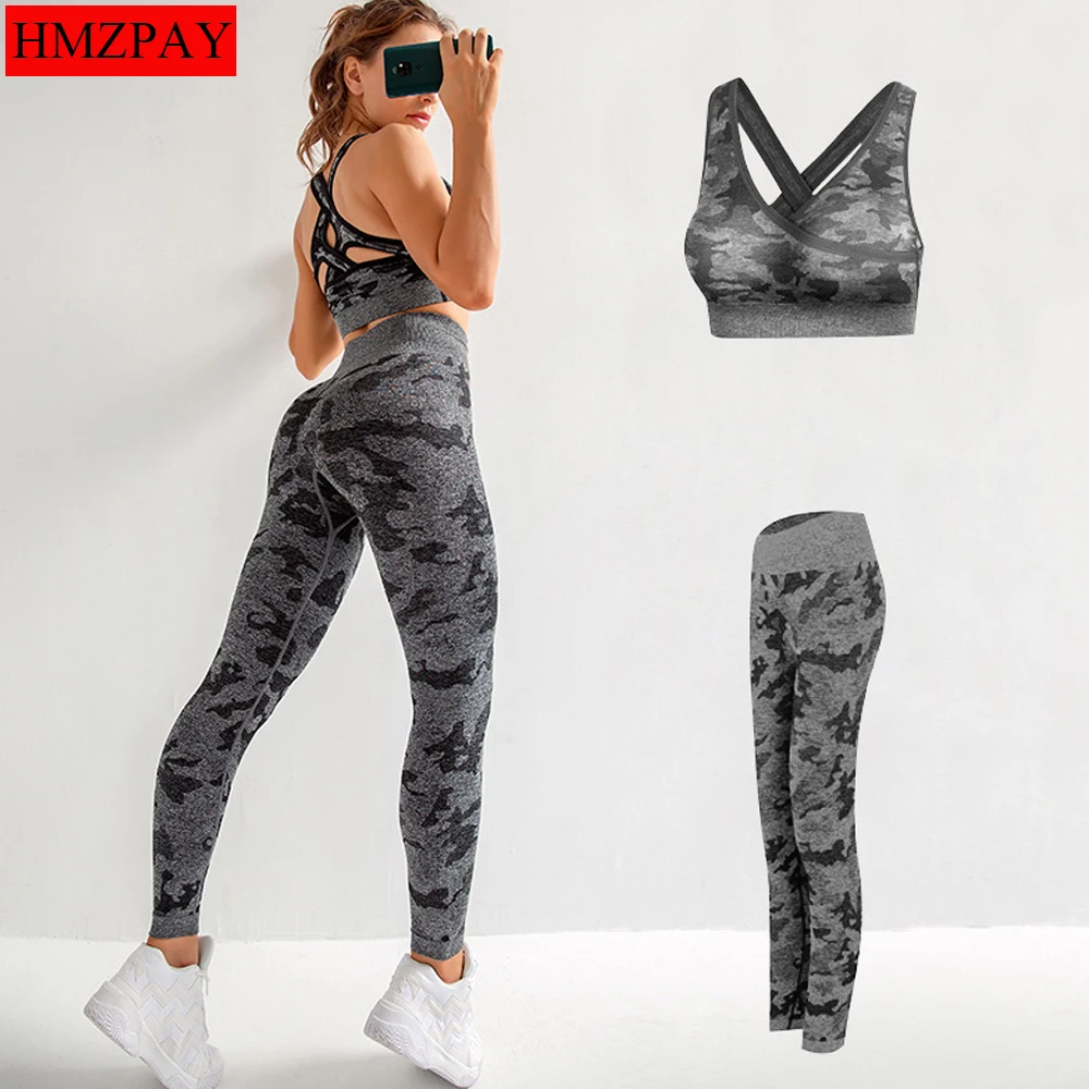 2 шт. Камуфляжный комплект для йоги, спортивная одежда для женщин, одежда для спортзала, фитнеса, ботинок, Леггинсы для йоги + спортивный бюстгальтер, женский спортивный костюм для спортзала
