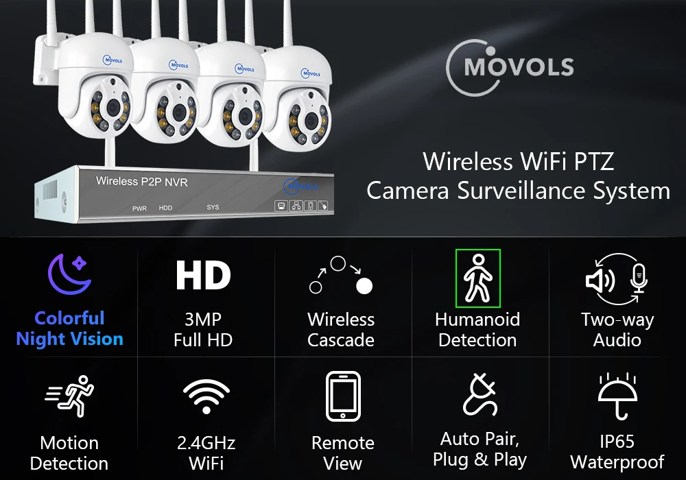 Movols H.265 3MP HD Беспроводная система видеонаблюдения двухсторонняя аудио Водонепроницаемая PTZ WIFI IP камера безопасности 8CH P2P NVR комплект видеонаблюдения
