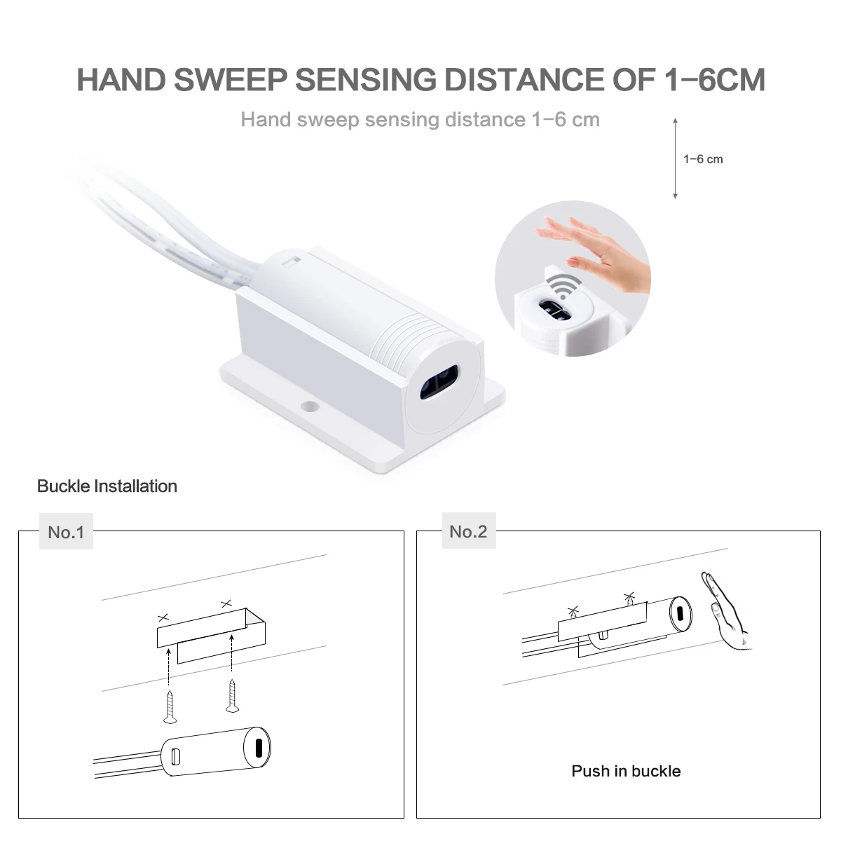 Тип переключателя: не затемняемый ручной датчик развертки Рабочее напряжение: 12V-24VDC Номинальный ток: 5A Номинальная мощность: 60 Вт Статический ток: ≤ 3 мА Угол индукции: 12 ° Расстояние срабатывания: 2-5 см Режим индукции: индукция инфракрасного отражения