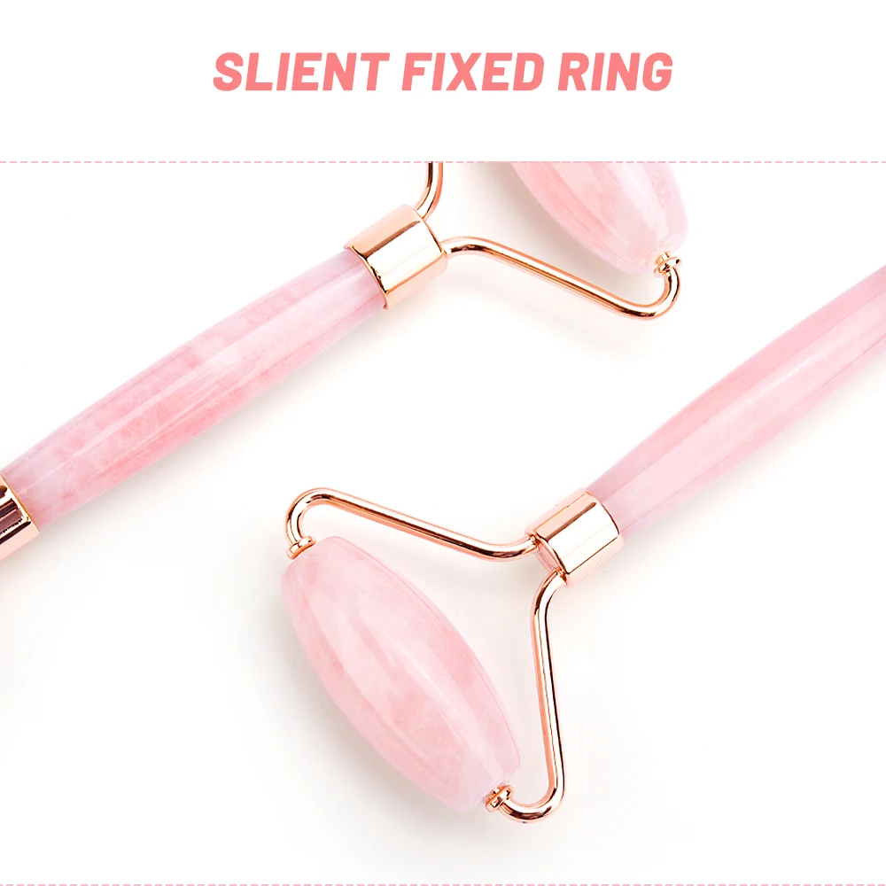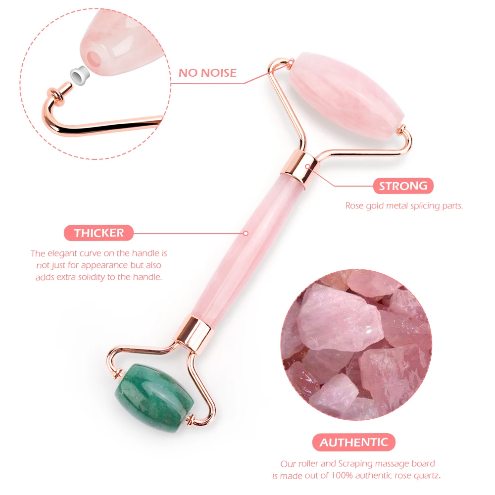 Двусторонний ролик из розового кварца, большой ролик идеально подходит для шеи, подбородка, щек и лба, в то время как ролик поменьше идеально подходит для области вокруг глаз, носа и губ. Ролик способствует кровообращению, что может уменьшить отечность и количество морщин