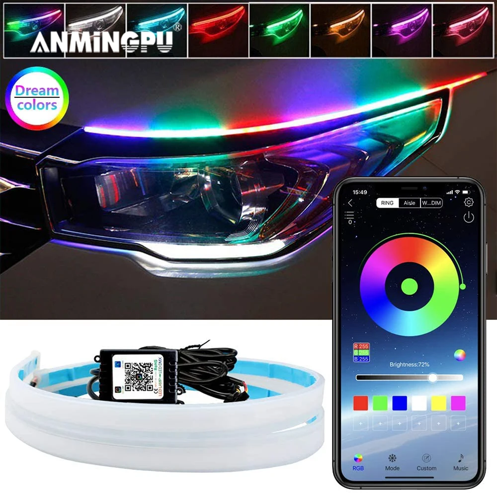 Гибкие светодиодсветодиодный дневные ходовые огни ANMINGPU 2 шт. с приложением DRL для автомобильных фасветильник, последовательная RGB DRL светодиодная полоса, поворотник, желтая сигнальная лампа