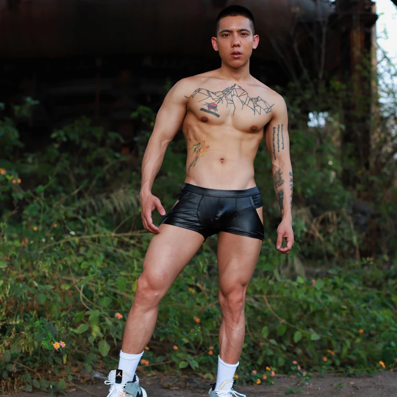 Трусы-боксеры мужские из искусственной кожи, с открытой ягодицами