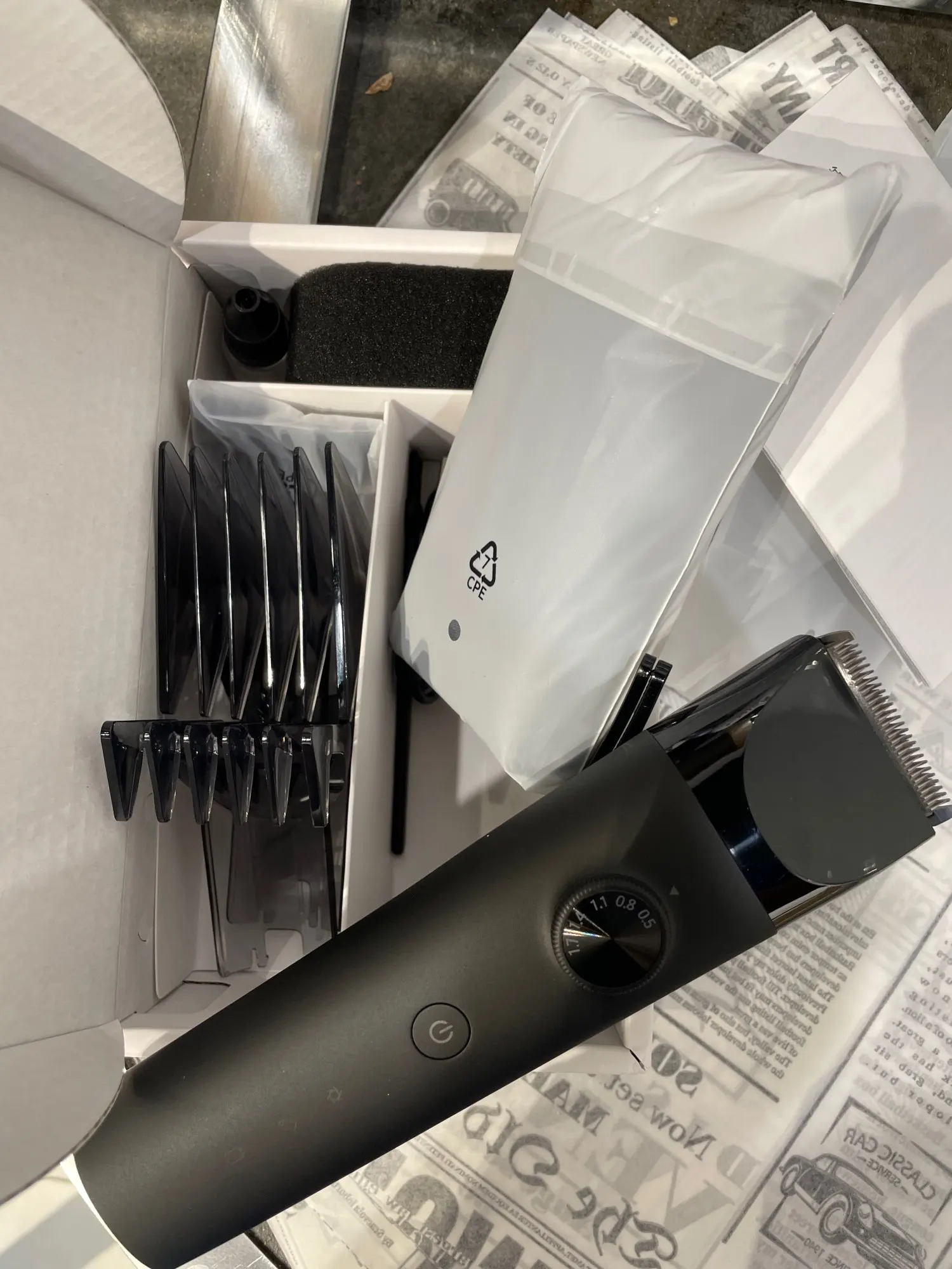 Товар пришел за 2 недели, комплект очень богатый, сама машинка, 3 насадки, щётка для очистки лезвий, смазка для лезвий, прищепка для волос, кабель type-c 10 см и даже халат для стрижки!!! Брал за 1500 с купоном. Машинка работает, беспроводная, есть регулировка высоты лезвий, ручка из софт тач удобная.