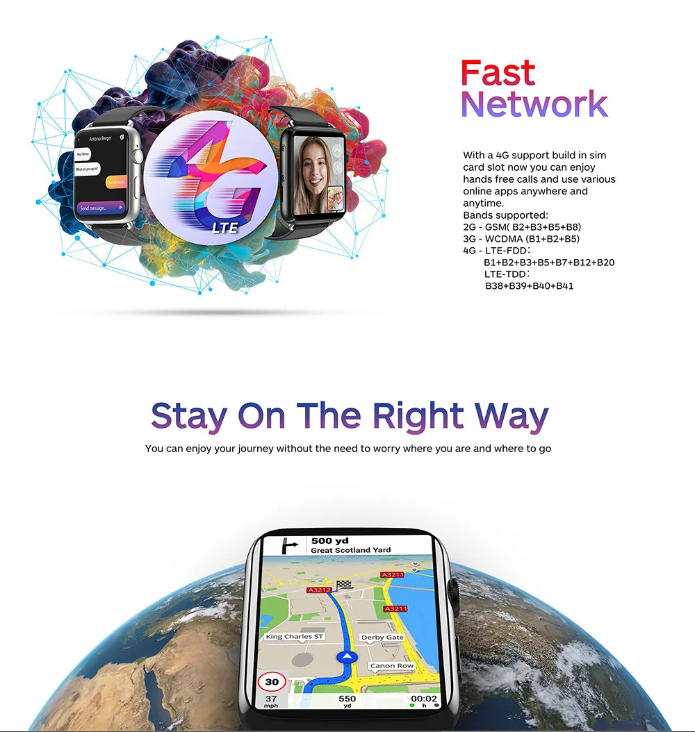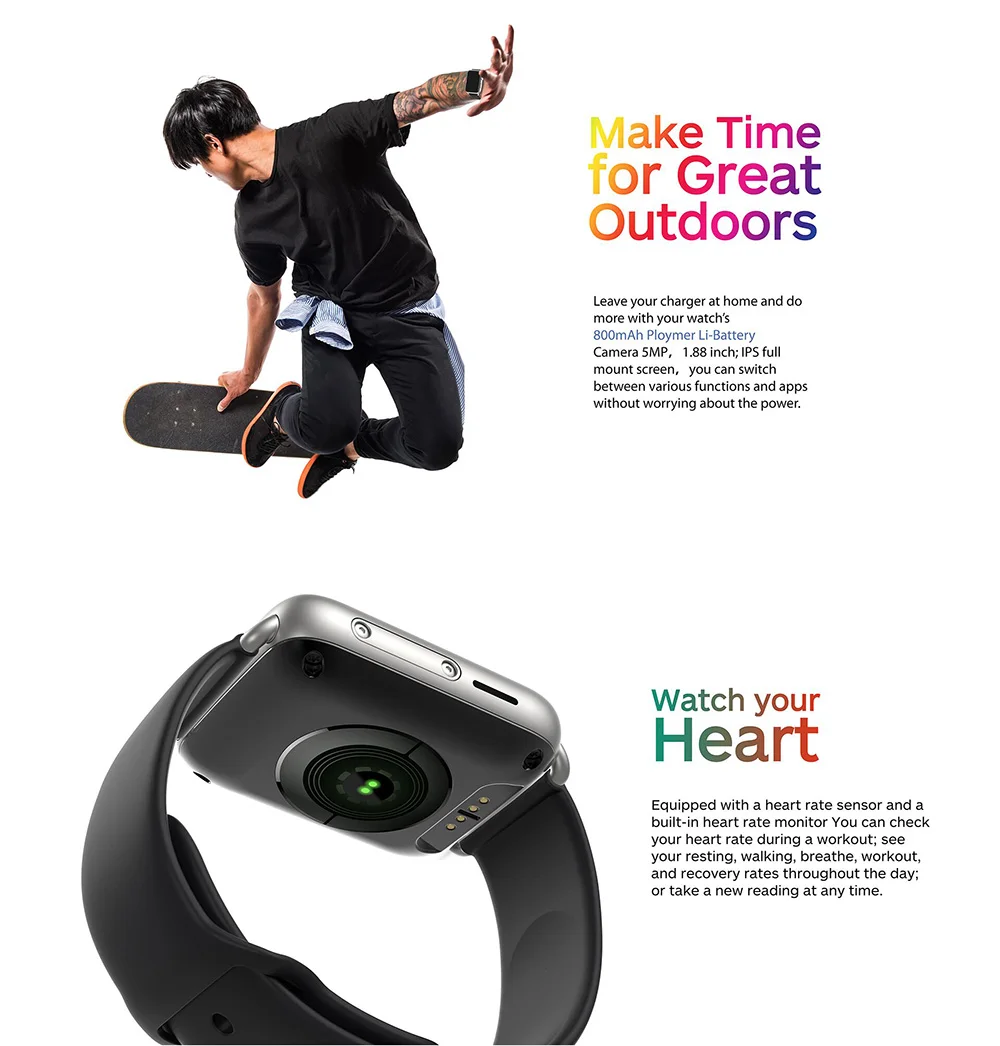 Работает на ОС Android 7,1, работает от высокопроизводительного четырехъядерного процессора MTK6739. 1 Гб RAM + 16 Гб ROM (или 3 Гб RAM + 32 ГБ ROM опционально) в конечном итоге обеспечивает более богатый опыт использования. Встроенный слот Nano SIM: Поддерживает независимую функцию вызова 4G. Просто подключите свою Nano sim-карту, чтобы позвонить напрямую, не нужно носить с собой мобильный телефон во время занятий спортом. Шагомер и мониторинг сердечного ритма: Разумно рассчитать ваши шаги движения и расстояние, заботясь о вашем здоровье. Поддерживает запись сердечного ритма, чтобы быть в курсе вашего физического состояния. HD экран: 1,88 дюймовый сенсорный экран с разрешением до 320*360p, изображение гладкое и прозрачное, стильное и крутое, не теряя жизненную силу. Больше удобства: Поддержка BT, gps-навигации и WiFi. Со встроенным большим динамиком вы можете наслаждаться музыкой, когда захотите. 2MP HD камера записывает каждый хороший момент. IP67 водонепроницаемый: Эти умные часы являются водонепроницаемыми и защищенными от пота. Вы можете носить его, чтобы мыть руки и под дождем, но вы не можете носить его во время ванны и плавания.