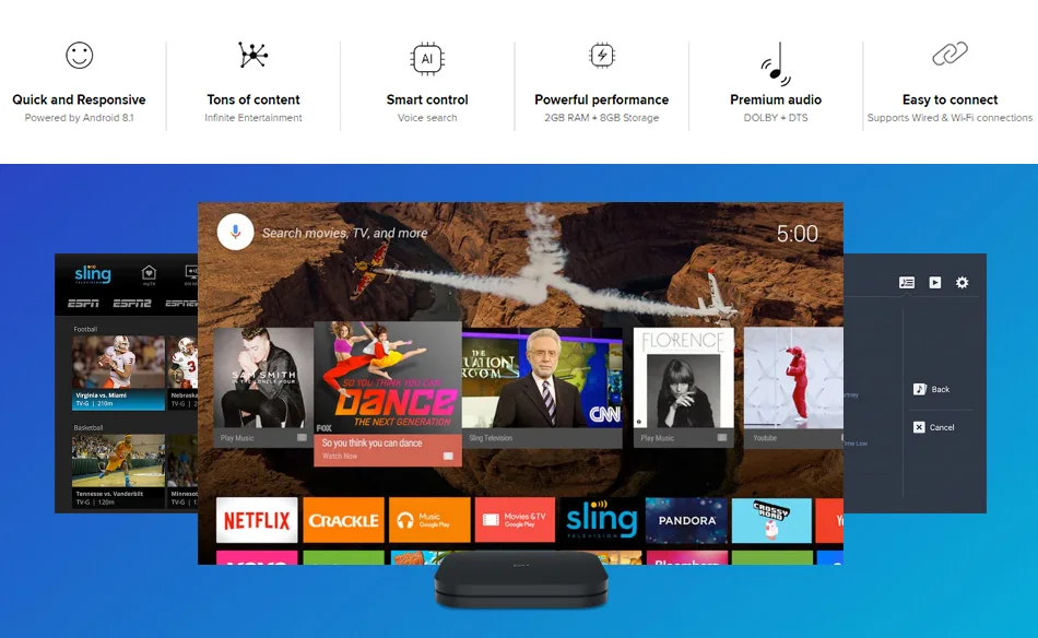 Питание от Android 9,0 для превосходной функциональности Mi Box S питается от Android 9,0, прост в использовании и поддерживает голосовой поиск И Chromecast, а также обеспечивает мир контента, которым может наслаждаться вся семья