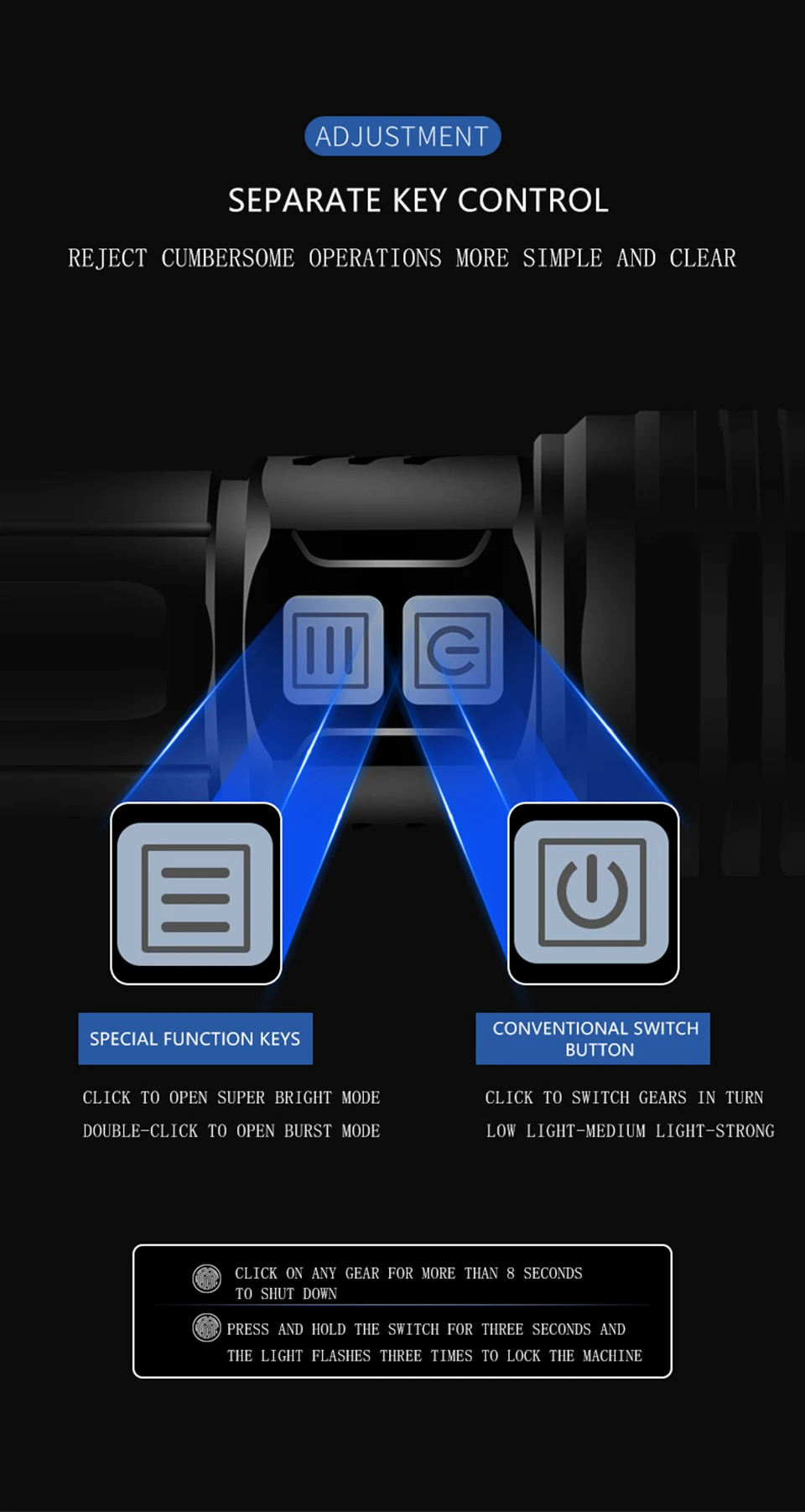 5-скоростной режим: 50%-75%-100%; Вспомогательный переключатель: Нажмите высокое светильник-нажмите дважды стробоскоп