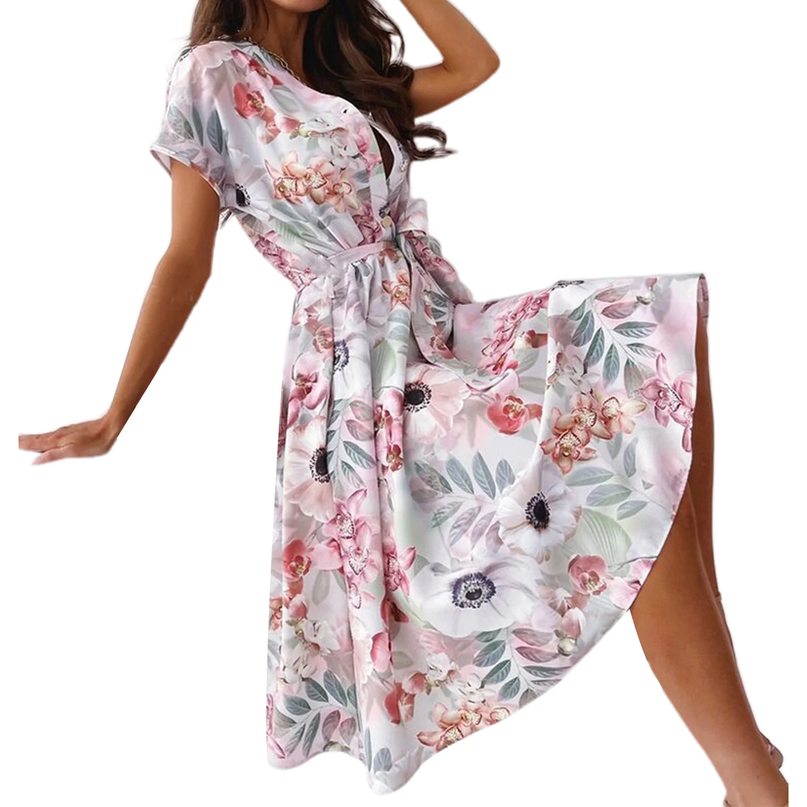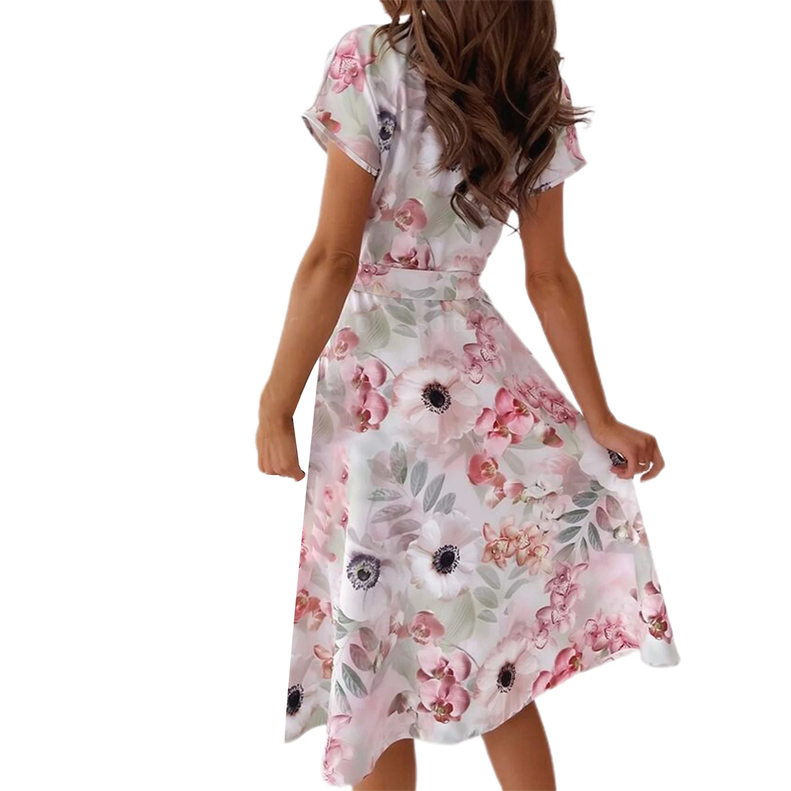 Женское Повседневное платье с цветочным принтом, свободная юбка до колен с V-образным вырезом и короткими рукавами, золотистогоперсиковогорозового цвета, для лета